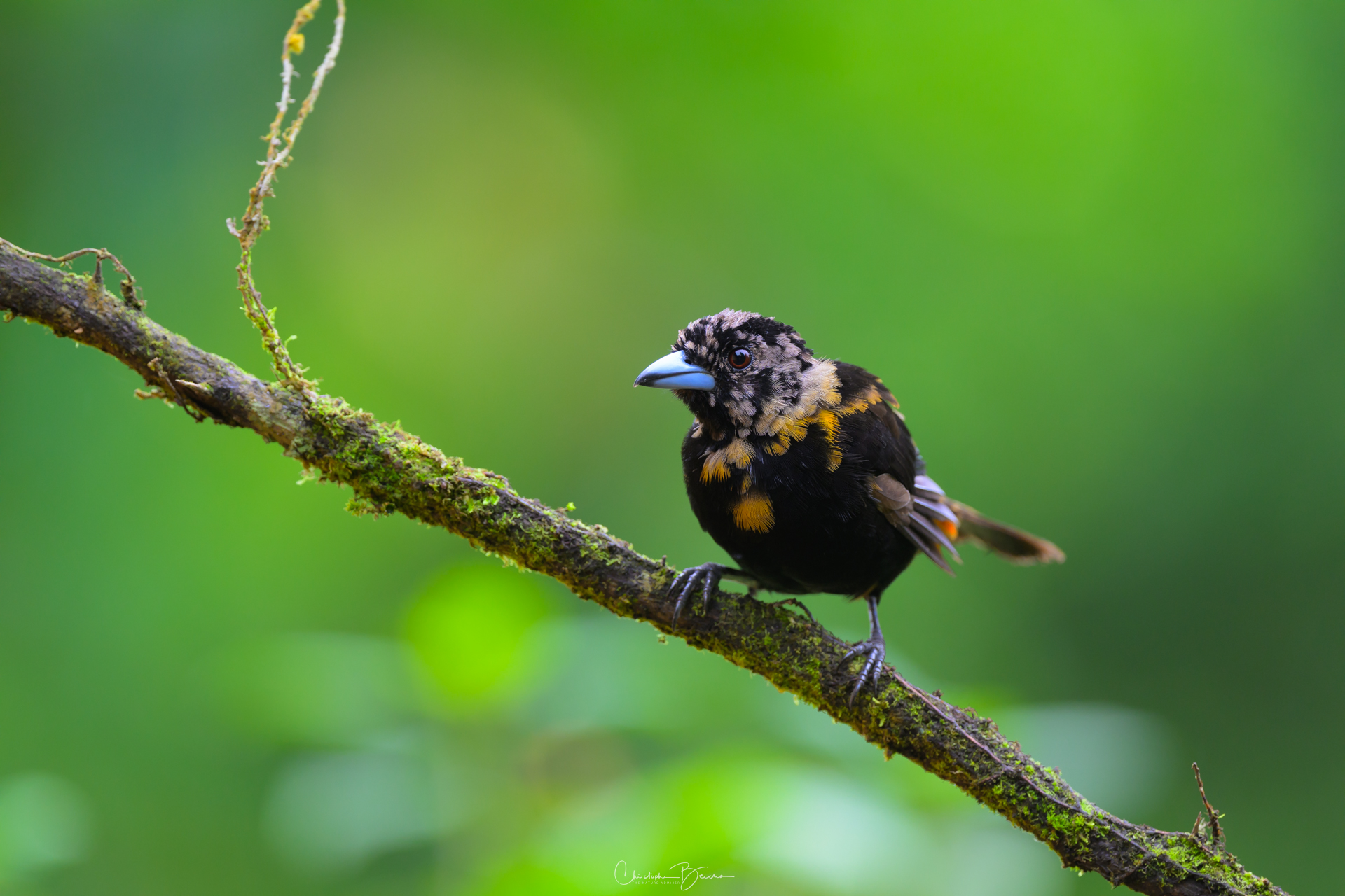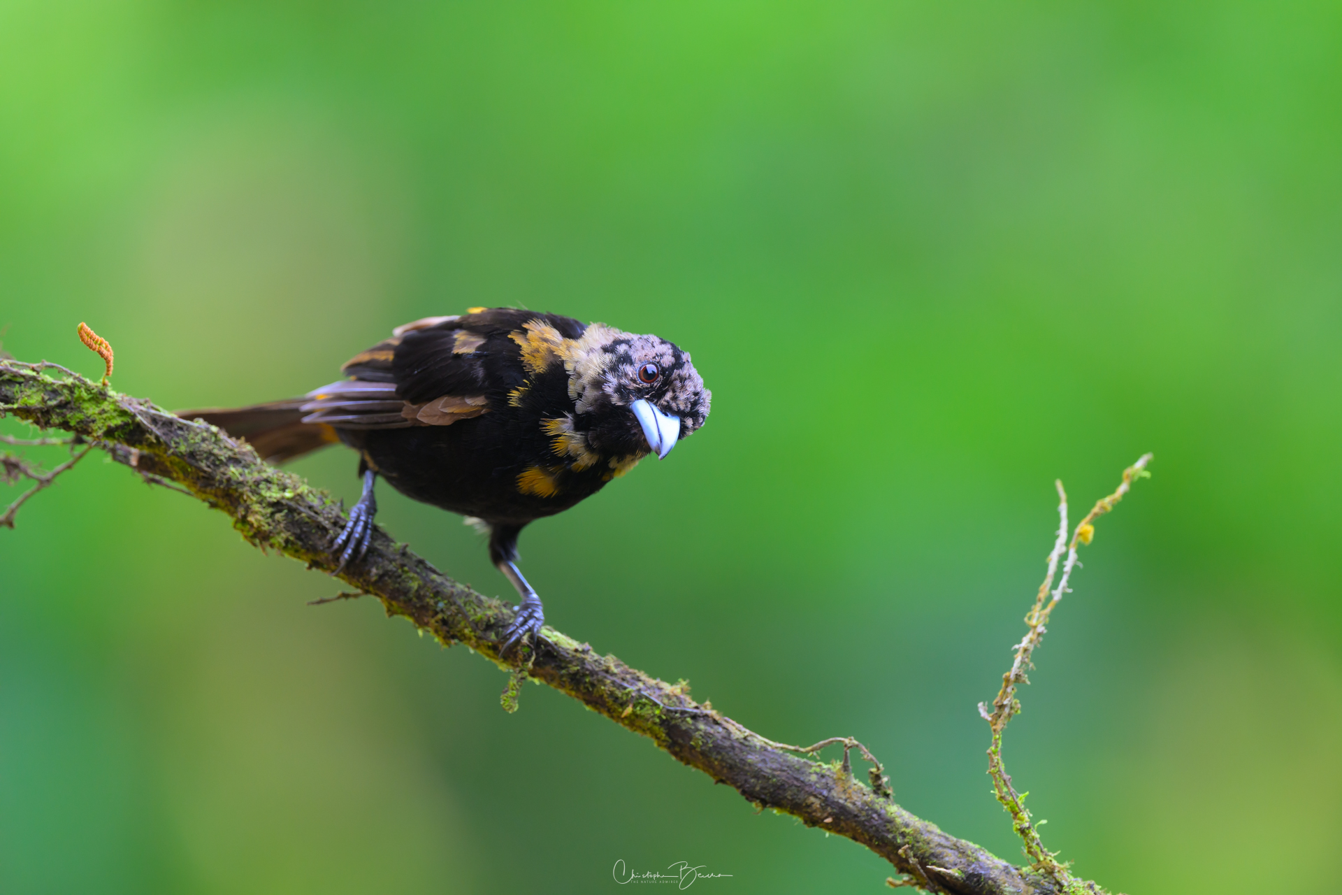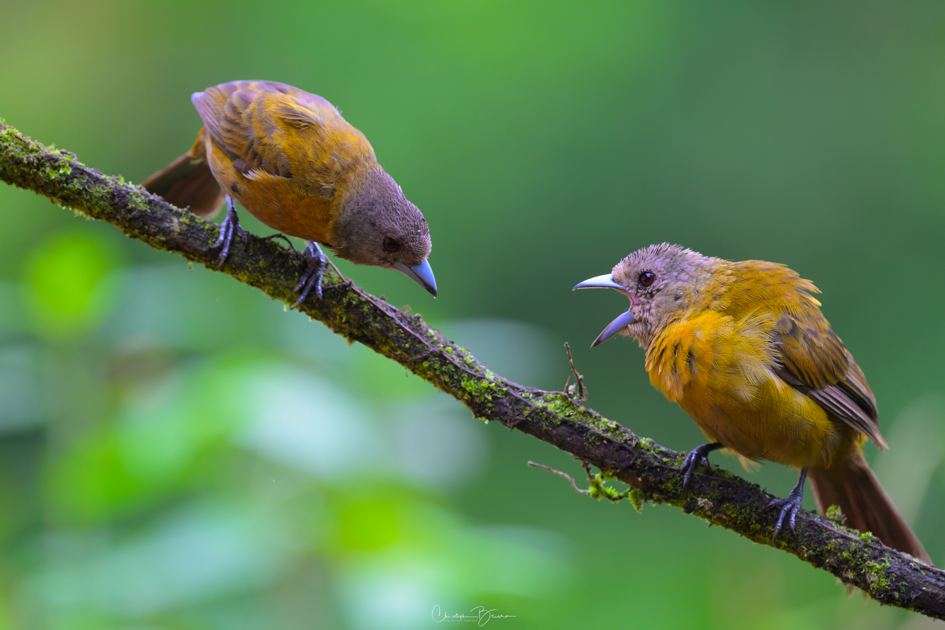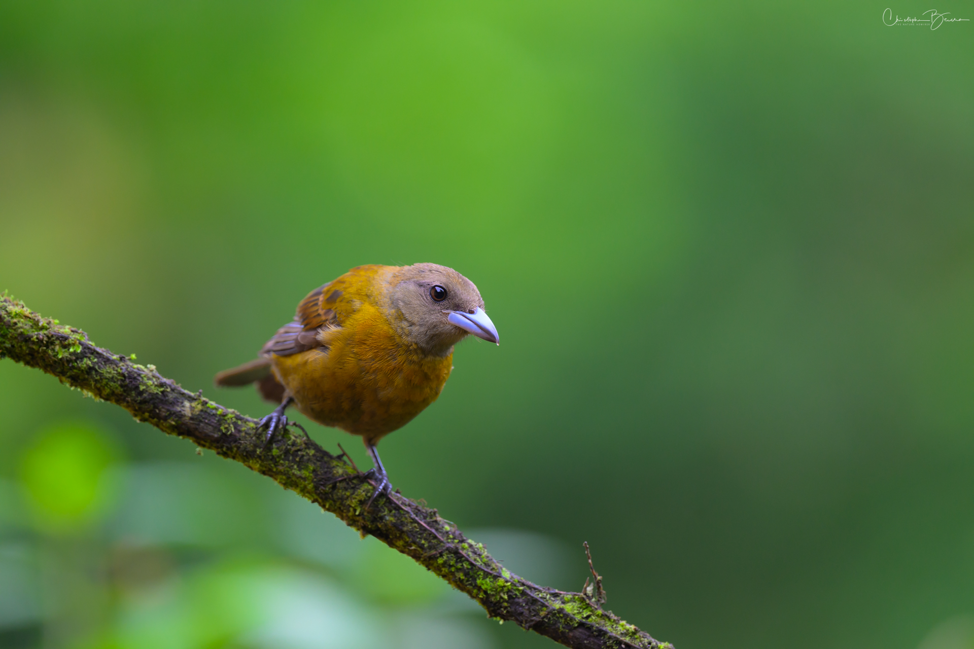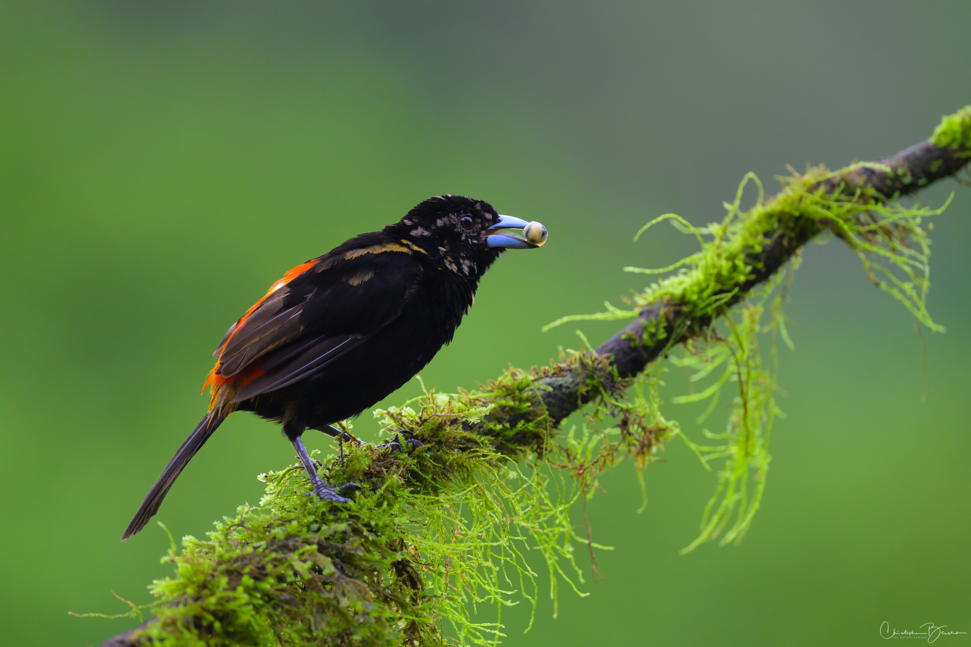 The Scarlet-rumped Tanager is known locally as “Sargento” (Seargent) and “Sangre de Toro” (Bull’s blood), among other names. Previously it was known as the Passerini´s Tanager, being virtually identical to the Cherries Tanager, but only inhabiting the Caribbean, whereas the Cherries was only found in the pacific. In sunlight, the red rump of the male glows strongly, contrasting with the deep black in the eyes and the rest of the body. The female is brownish in coloration, and differs from the Cherries by not having the orange throat. The Juvenile male has the same coloration as the female, however as it morphs into adult plumage, patches of black start to show in the body, giving it kind of a Calico look.