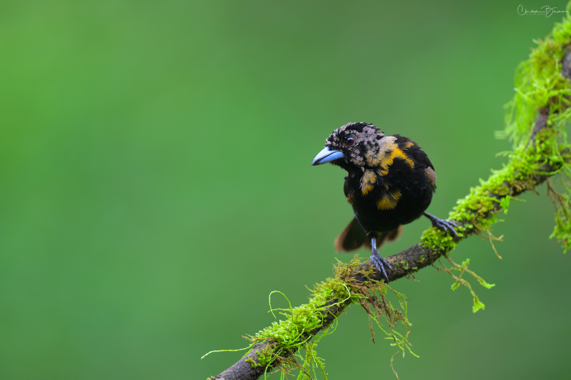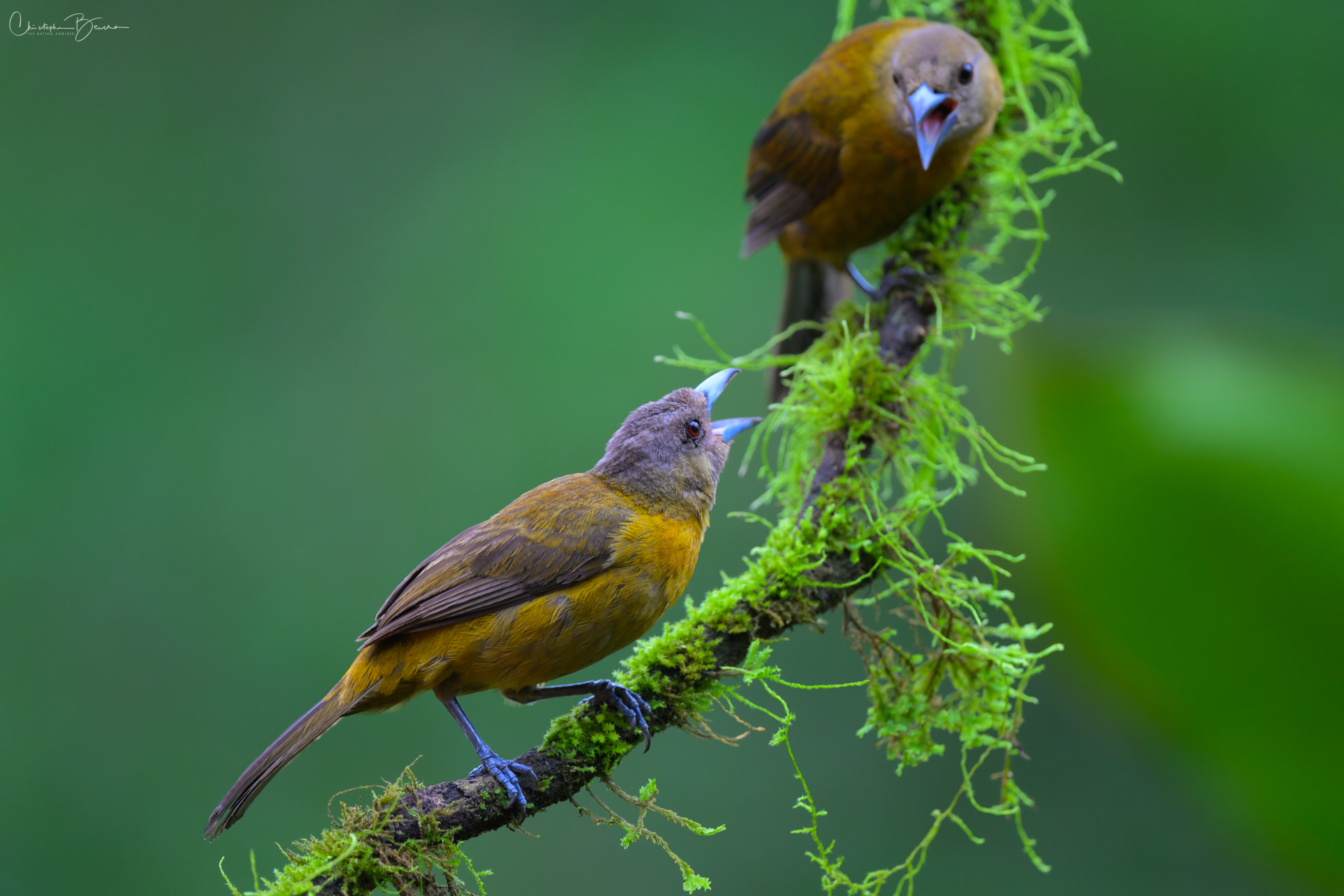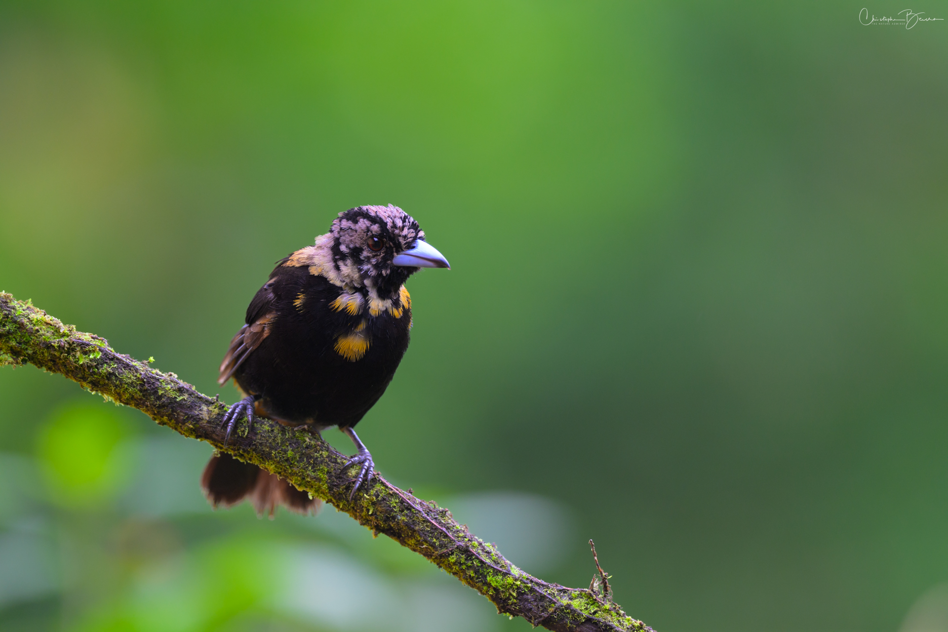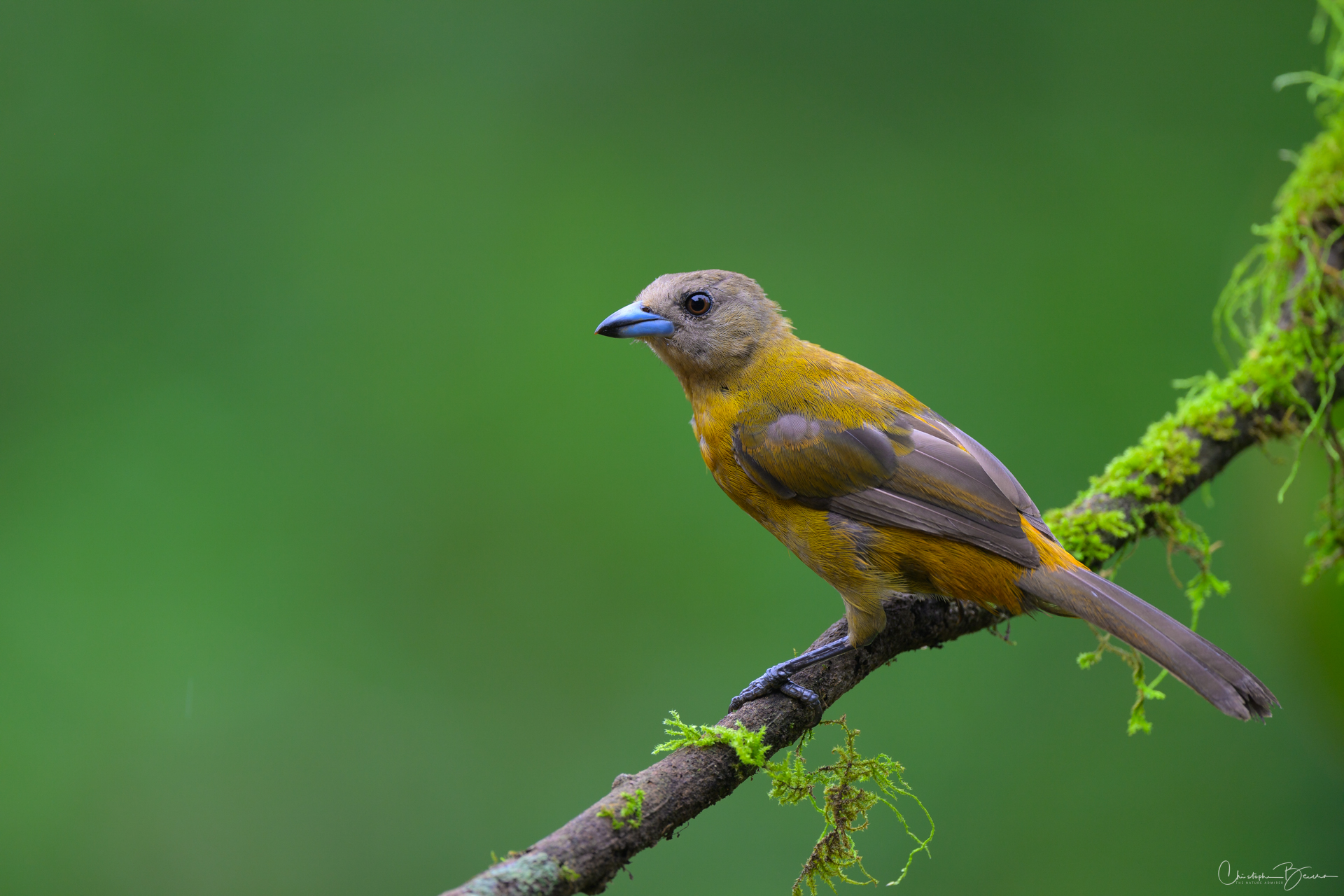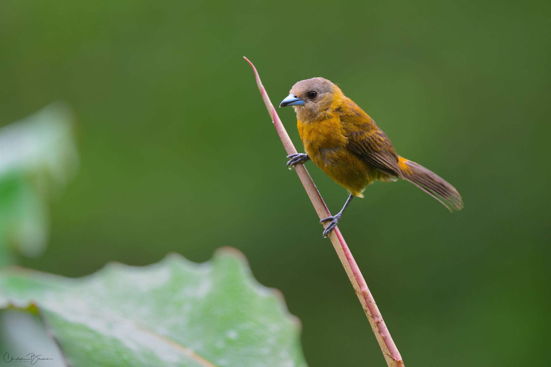 The Scarlet-rumped Tanager is known locally as “Sargento” (Seargent) and “Sangre de Toro” (Bull’s blood), among other names. Previously it was known as the Passerini´s Tanager, being virtually identical to the Cherries Tanager, but only inhabiting the Caribbean, whereas the Cherries was only found in the pacific. In sunlight, the red rump of the male glows strongly, contrasting with the deep black in the eyes and the rest of the body. The female is brownish in coloration, and differs from the Cherries by not having the orange throat. The Juvenile male has the same coloration as the female, however as it morphs into adult plumage, patches of black start to show in the body, giving it kind of a Calico look.