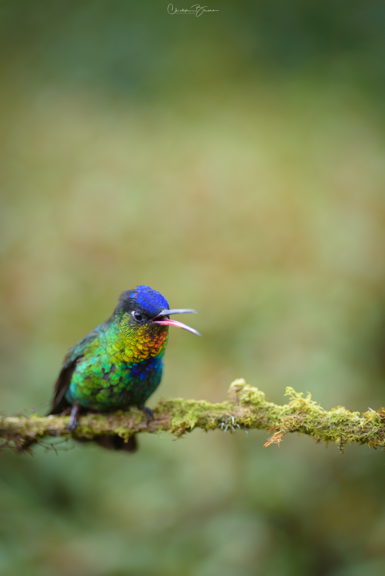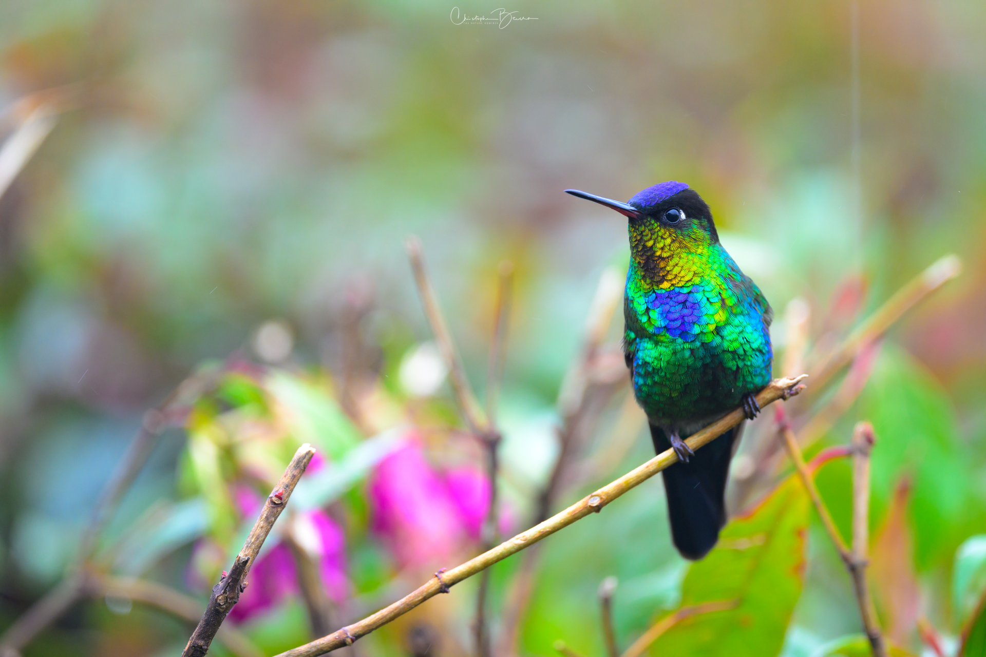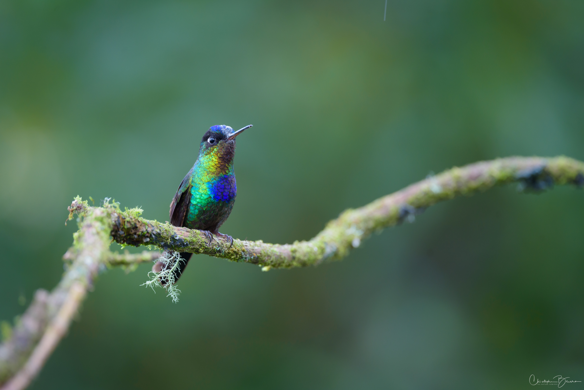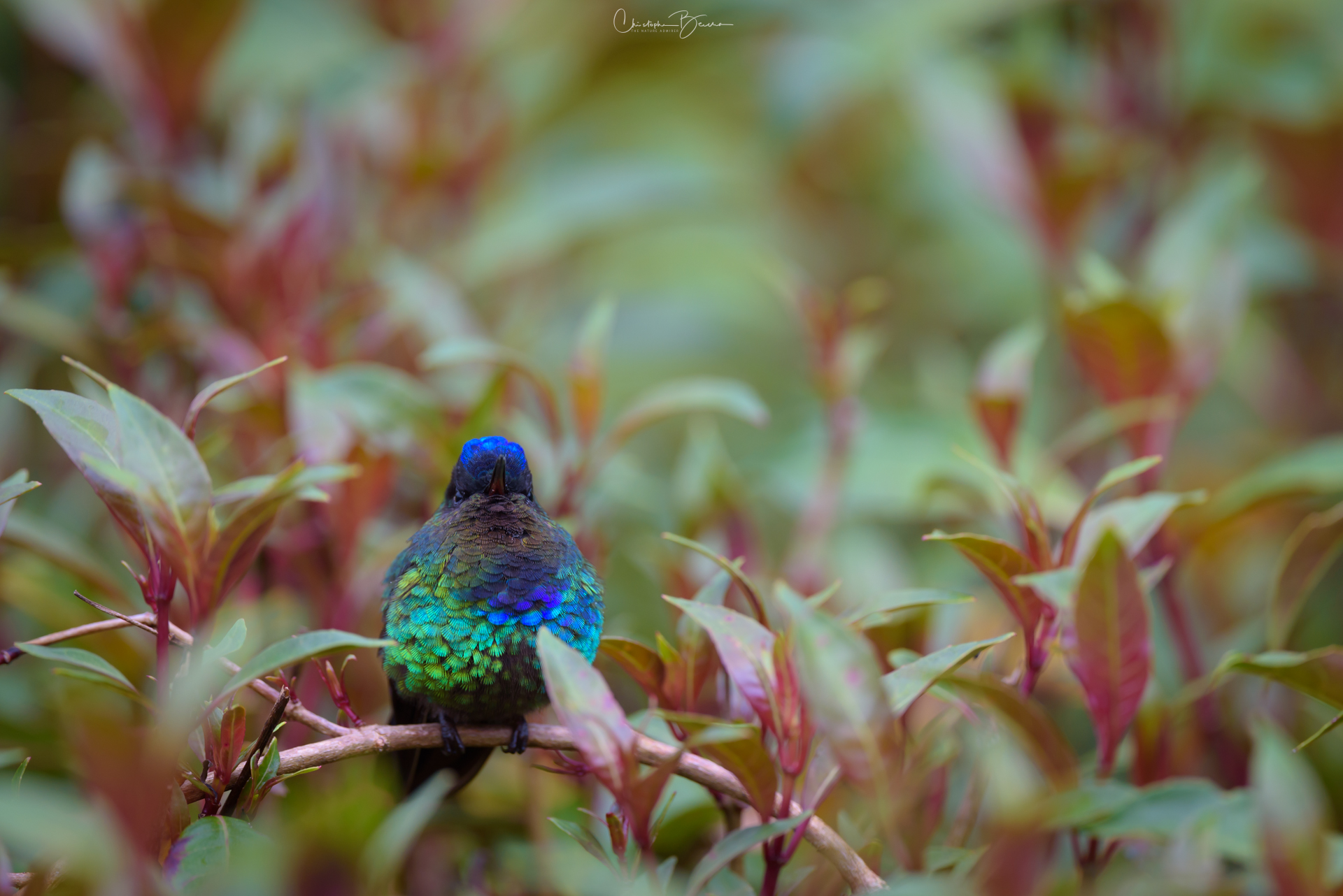 As is usual in Hummingbirds, the Fiery-throated Hummingbird shows iridescence in its plumage, by refracting light that hits in different angles and intensities. The result is a colorful plumage that changes with every so slight movement, and in the case of the Fiery-throated, it transforms into a rainbow of color. The challenge for any photographer is to obtain a picture of this active bird with the glowing yellow-red throat and blue chest. Getting that in-flight with natural light as the hummer approaches a flower with acrobatic movements is a matter of luck. To beat the odds, it is recommended to visit places like Paraiso Quetzal Lodge in Cerro de la Muerte, where these hummingbirds are abundant and have become used to people being around with their cameras. At times you can see tens of these birds in garden; they will often fight with one another and pass over your head at high speed. Other times they will perch in an almost catatonic state, ideal for classic portrait pictures.