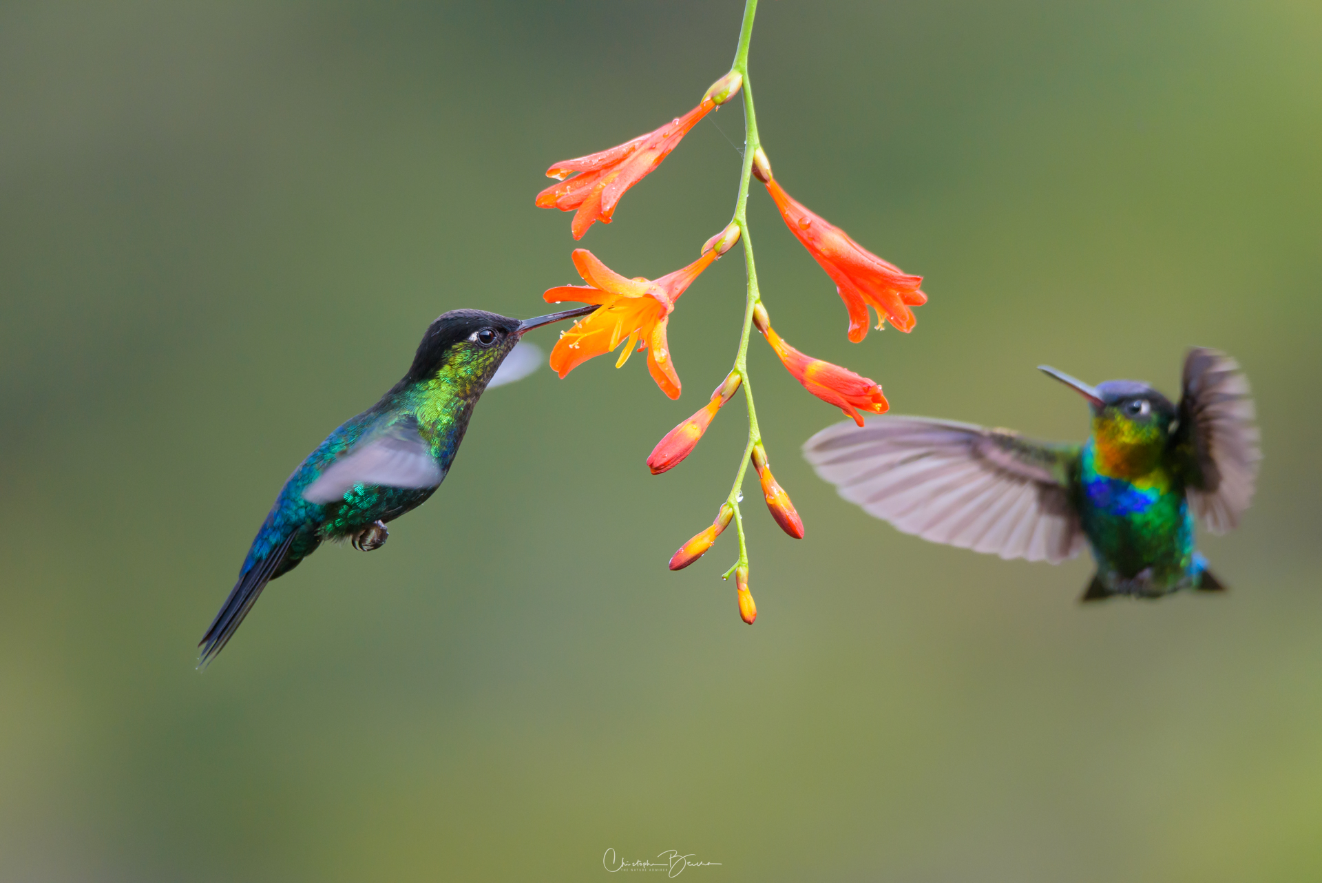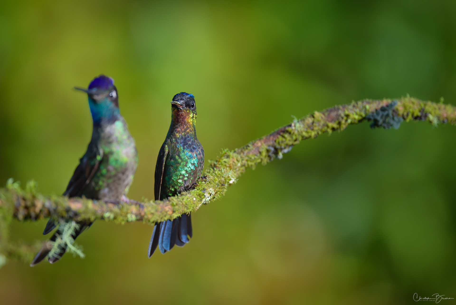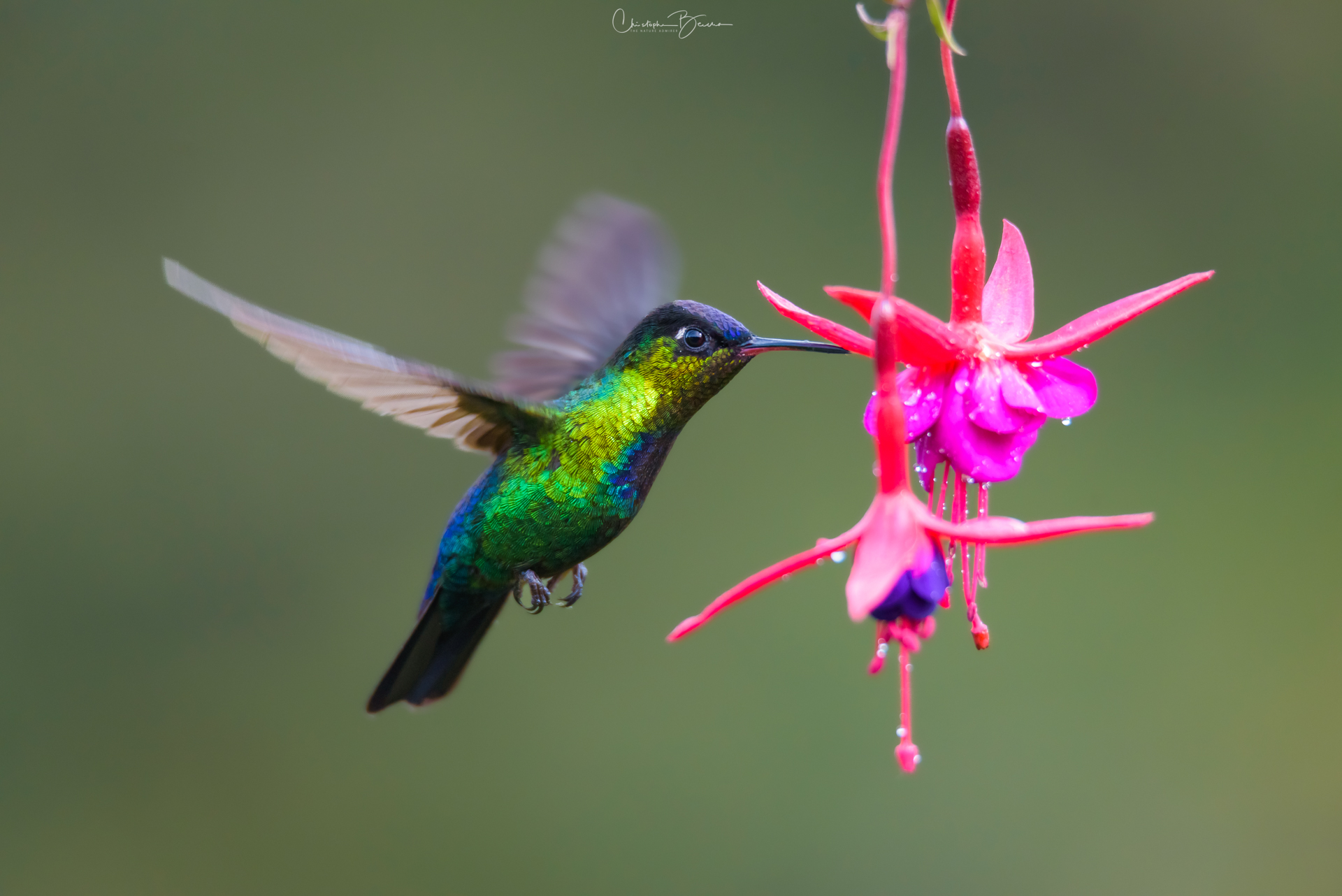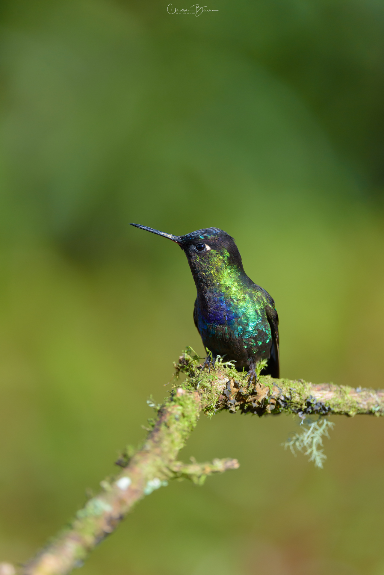 As is usual in Hummingbirds, the Fiery-throated Hummingbird shows iridescence in its plumage, by refracting light that hits in different angles and intensities. The result is a colorful plumage that changes with every so slight movement, and in the case of the Fiery-throated, it transforms into a rainbow of color. The challenge for any photographer is to obtain a picture of this active bird with the glowing yellow-red throat and blue chest. Getting that in-flight with natural light as the hummer approaches a flower with acrobatic movements is a matter of luck. To beat the odds, it is recommended to visit places like Paraiso Quetzal Lodge in Cerro de la Muerte, where these hummingbirds are abundant and have become used to people being around with their cameras. At times you can see tens of these birds in garden; they will often fight with one another and pass over your head at high speed. Other times they will perch in an almost catatonic state, ideal for classic portrait pictures.
