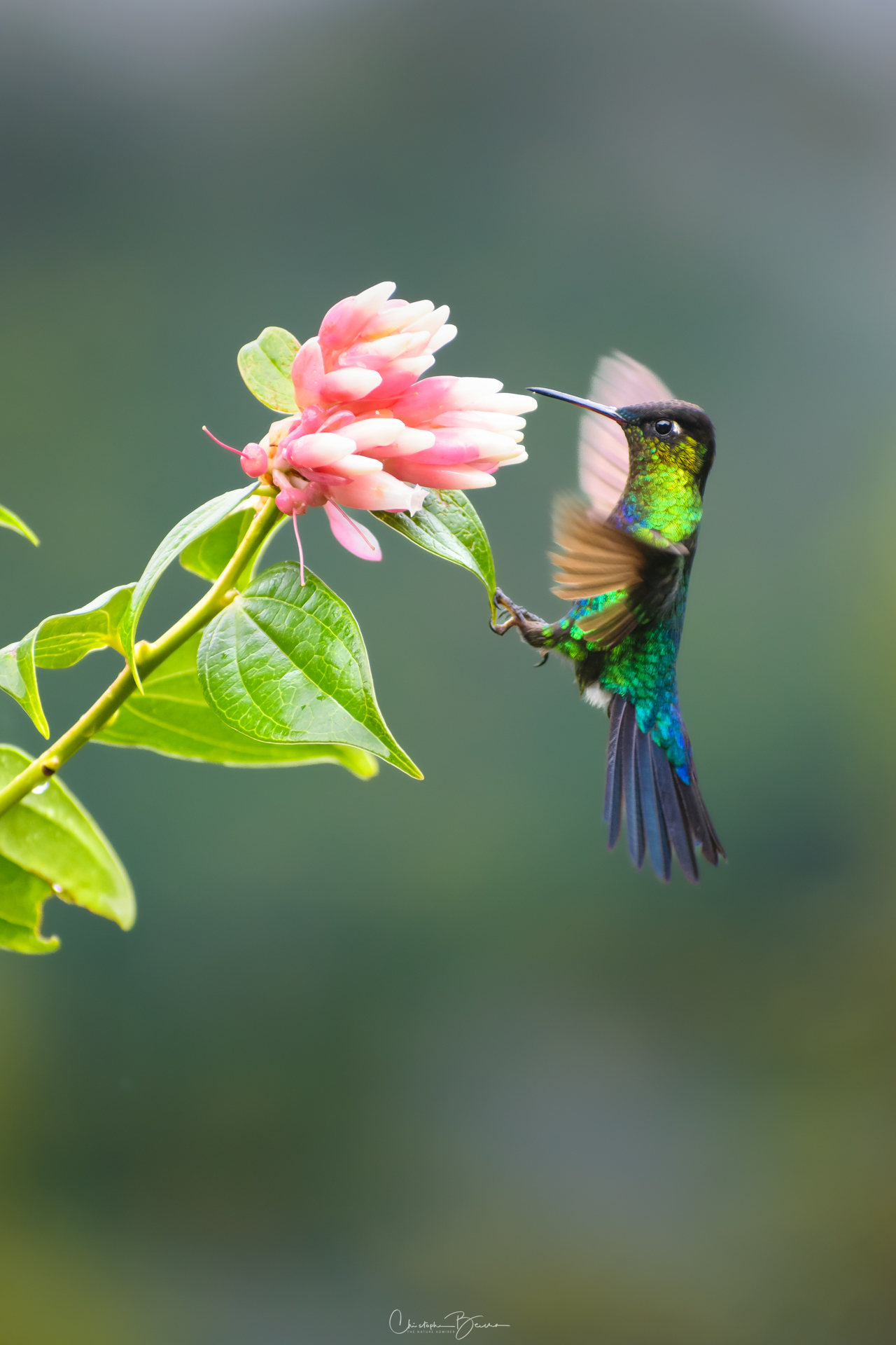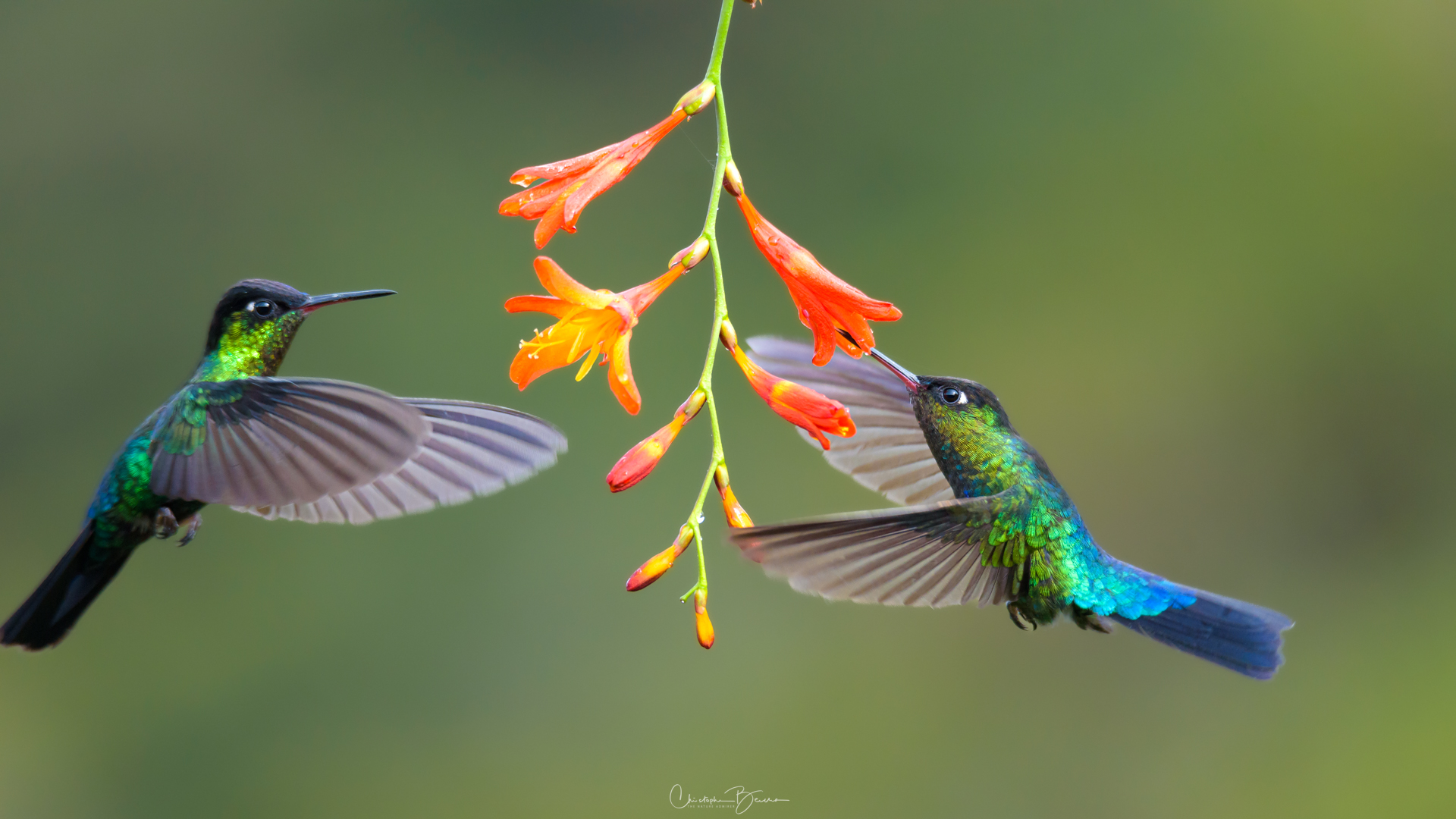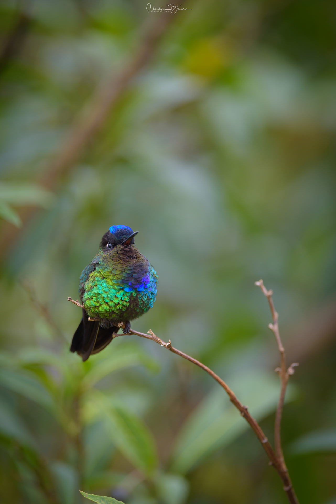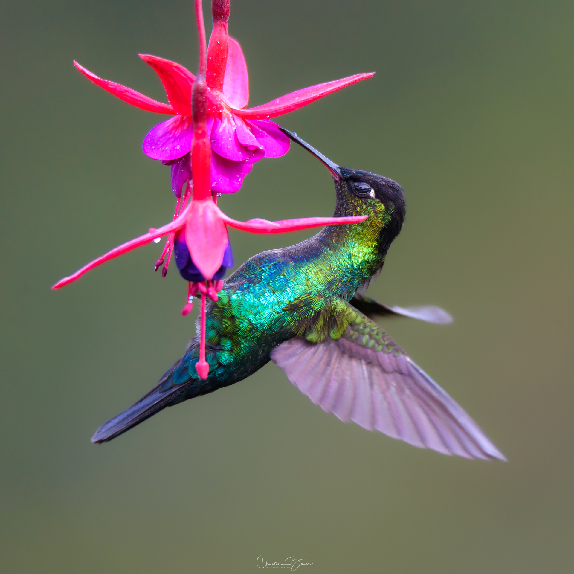 As is usual in Hummingbirds, the Fiery-throated Hummingbird shows iridescence in its plumage, by refracting light that hits in different angles and intensities. The result is a colorful plumage that changes with every so slight movement, and in the case of the Fiery-throated, it transforms into a rainbow of color. The challenge for any photographer is to obtain a picture of this active bird with the glowing yellow-red throat and blue chest. Getting that in-flight with natural light as the hummer approaches a flower with acrobatic movements is a matter of luck. To beat the odds, it is recommended to visit places like Paraiso Quetzal Lodge in Cerro de la Muerte, where these hummingbirds are abundant and have become used to people being around with their cameras. At times you can see tens of these birds in garden; they will often fight with one another and pass over your head at high speed. Other times they will perch in an almost catatonic state, ideal for classic portrait pictures.