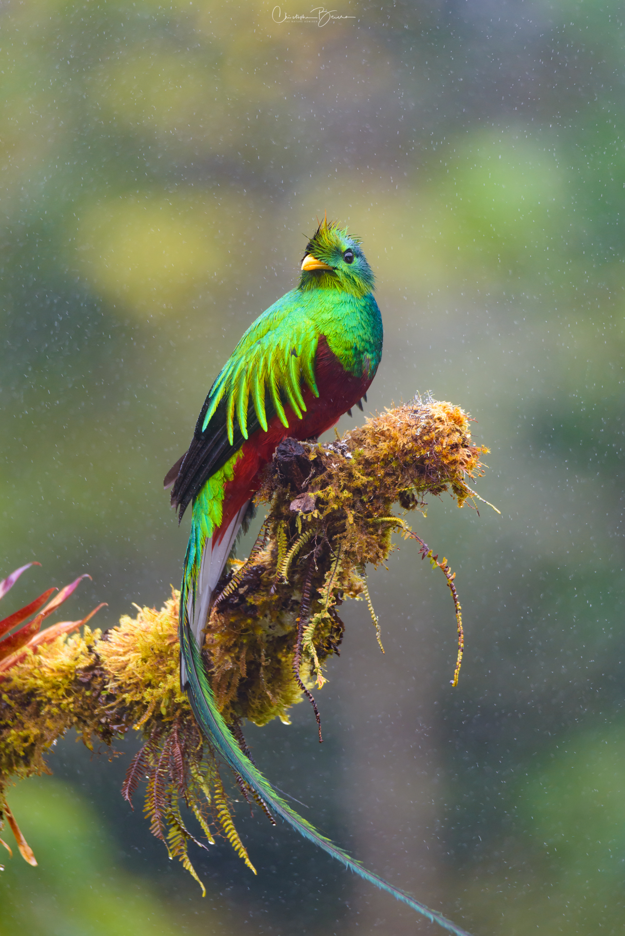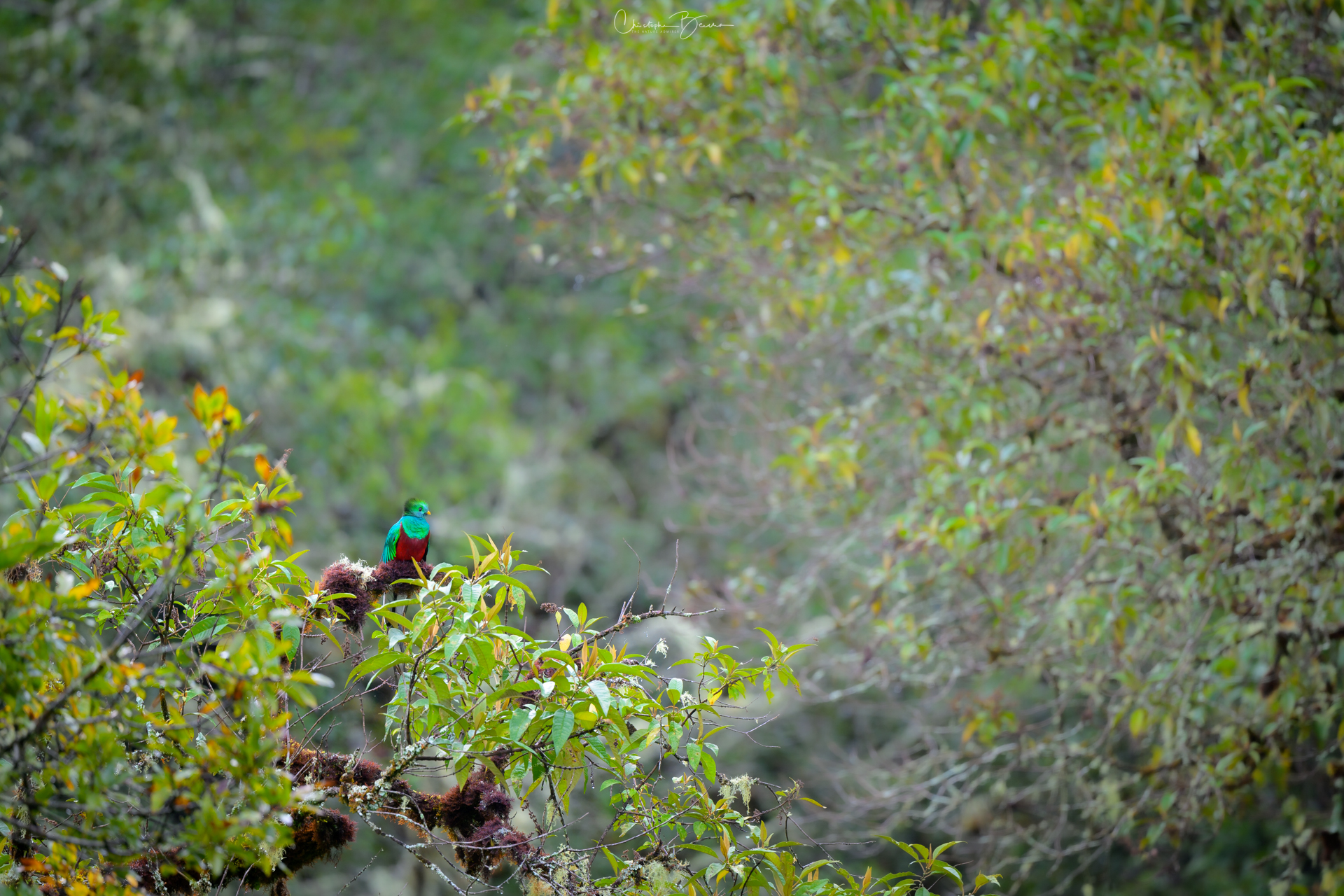 I could simply describe this bird as marvelous. The male has a scarlet belly and chest, with iridescent emerald green wing coverts, back and head. The wing feathers are actually green, while the underside of the true tail is white. The bill is yellow, and the iris is deep black. On the top of the head, some orange feathers break the green pattern. The most bizarre feature is the long “tail” feathers, measuring more than its standard body length, which breeding males carry fully grown from November to around May, at the end of the breeding season. They use those feathers to compete with other males to attract a female. While the female is not as exuberant, it is also a beauty. Their preferred food is the “Aguacatillo” fruit, which translates to “little avocado”. There are many species of this tree, which grow and bear fruit at different elevations and different times of the year, provoking what is known as altitudinal migration.