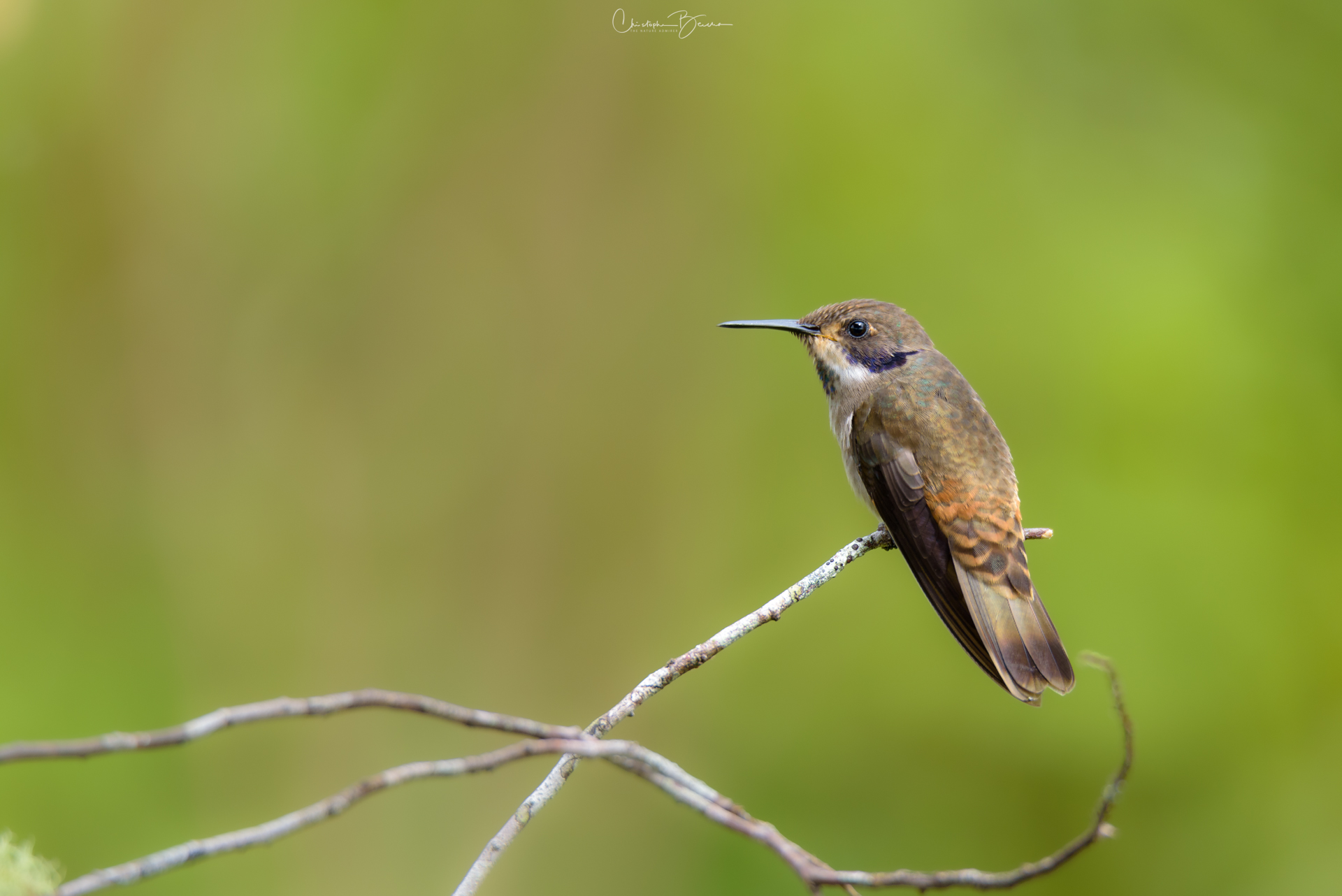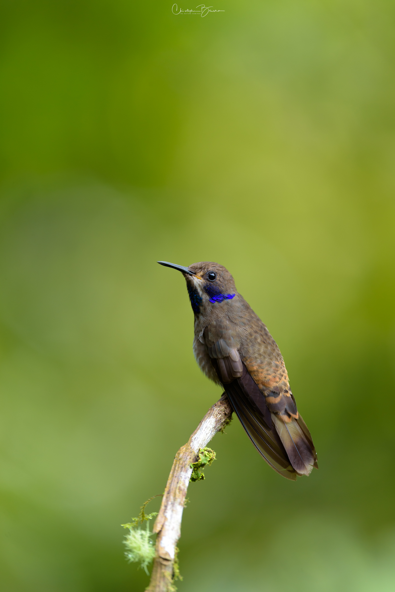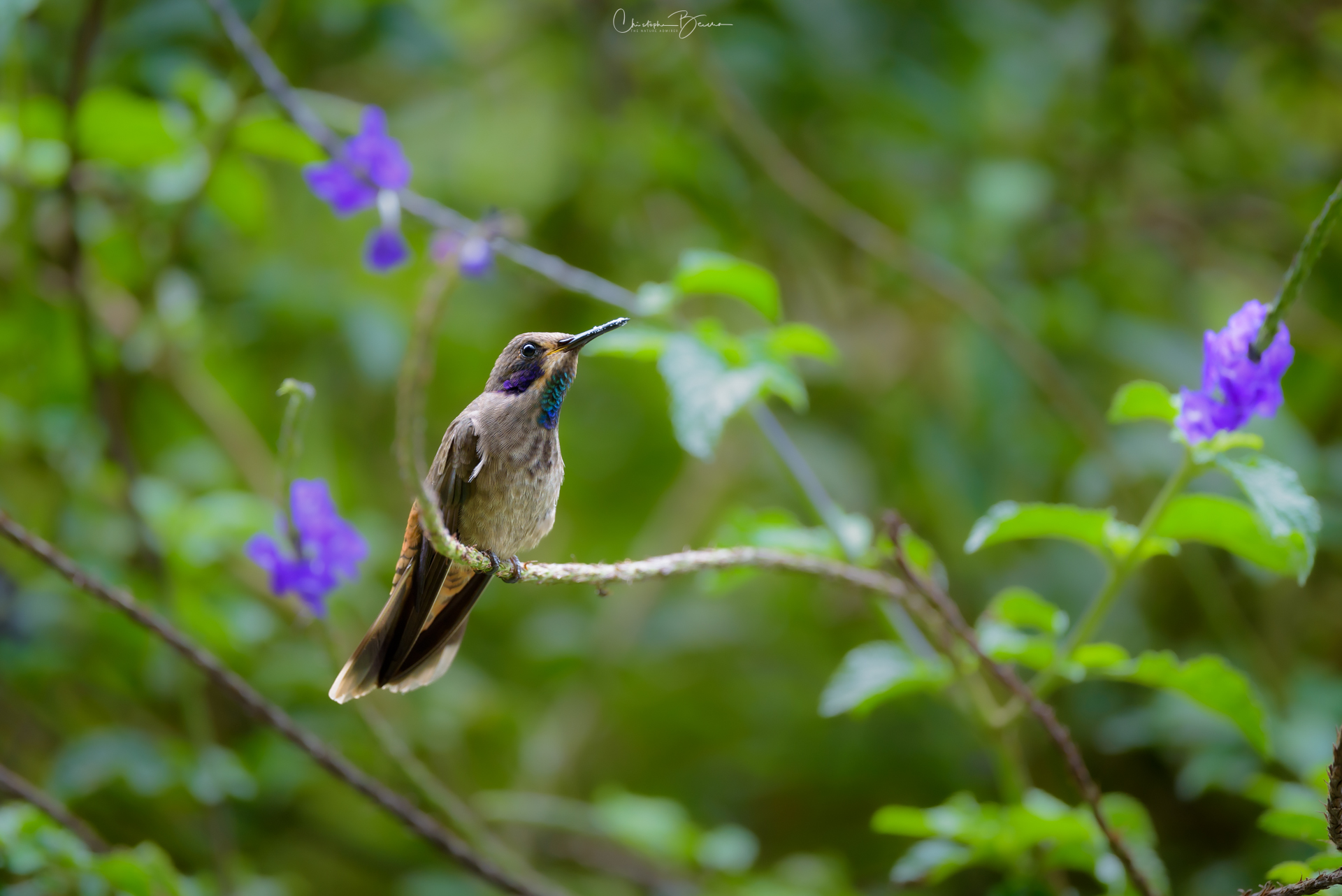 The Brown Violetear is a medium-sized hummingbird which has a violet ear patch, not surprising given its name. The body is mostly brown in coloration, with darker wing and tail feathers. The feathers covering its vent are whitish, as well as some of the throat feathers surrounding a small colorful patch in the center. It possesses a patch of green to blue iridescent feathers in the throat, something the Lesser Violetear does not possess. The black bill is relatively short and straight, which it uses to sometimes catch small insects on the flight. It is found in mid to high altitudes, particularly in humid areas where Porter Weed flowers are plentiful. Their small size and light weight let them perch in delicate branches without breaking them.