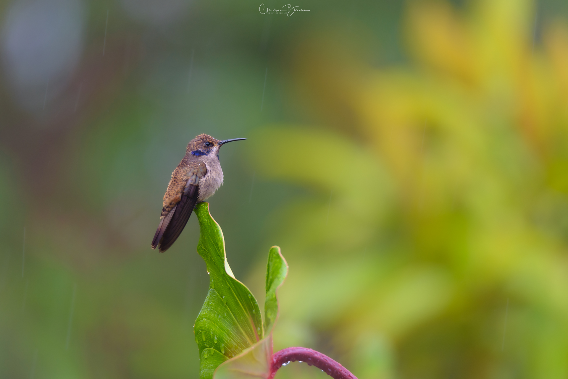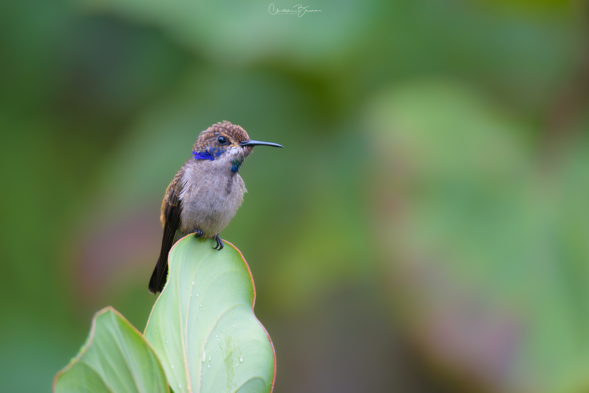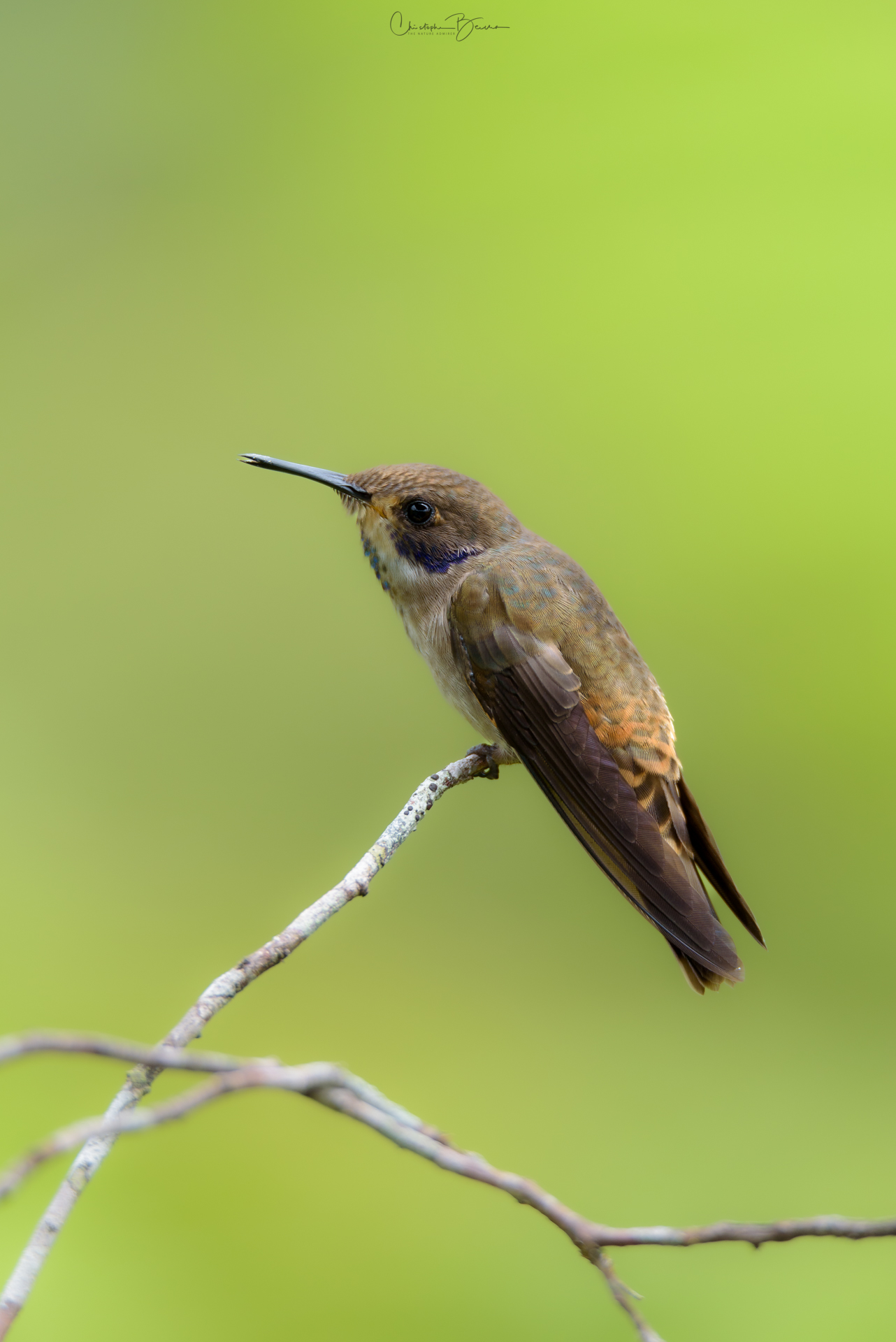 The Brown Violetear is a medium-sized hummingbird which has a violet ear patch, not surprising given its name. The body is mostly brown in coloration, with darker wing and tail feathers. The feathers covering its vent are whitish, as well as some of the throat feathers surrounding a small colorful patch in the center. It possesses a patch of green to blue iridescent feathers in the throat, something the Lesser Violetear does not possess. The black bill is relatively short and straight, which it uses to sometimes catch small insects on the flight. It is found in mid to high altitudes, particularly in humid areas where Porter Weed flowers are plentiful. Their small size and light weight let them perch in delicate branches without breaking them.