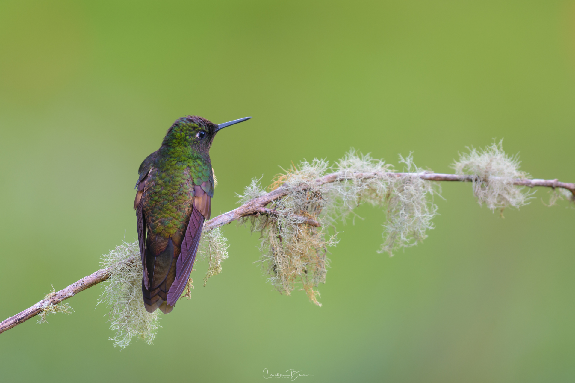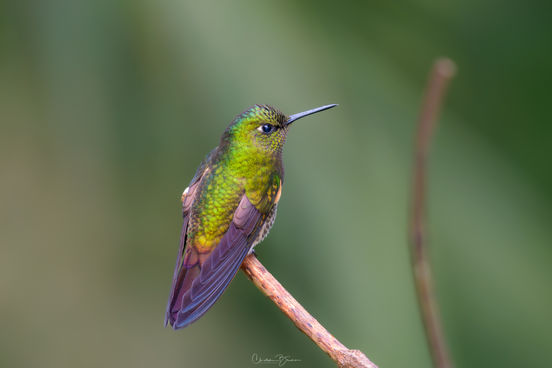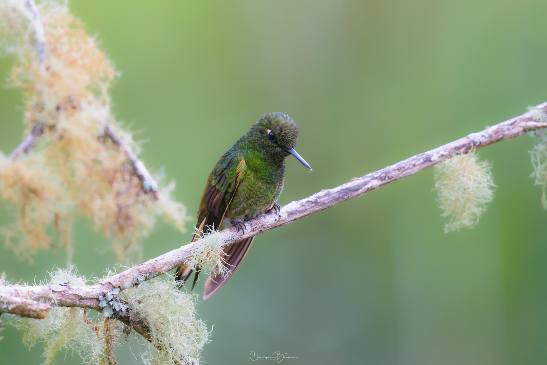 The Buff-tailed Coronet is among the most common hummingbirds in the areas of Colombia we visited. Its body color is green in general, with a scaled pattern on the belly, although the back can look reddish under the right light. The wings are brown and are long enough to cover the tail when folded down and perched. The white postocular spot is a defining feature, along with the buffy shoulders and white feathers that cover their feet, similar to the Booted Racket-tail. The bill is short and straight, entirely black. They like to perch for a few minutes in small branches, and when their feel their personal space is threatened by other individuals, they may put up a fight on the wing. Sometimes they perched alone, peacefully resting before flying again to drink more nectar, both from nearby flowers and from the feeders. It may not be the flashiest in terms of colors and anatomy, but it sure is beautiful to watch. In Rio Blanco Natural Reserve where we first saw them, they swarm in big numbers around the feeders, fighting each other and with other species.