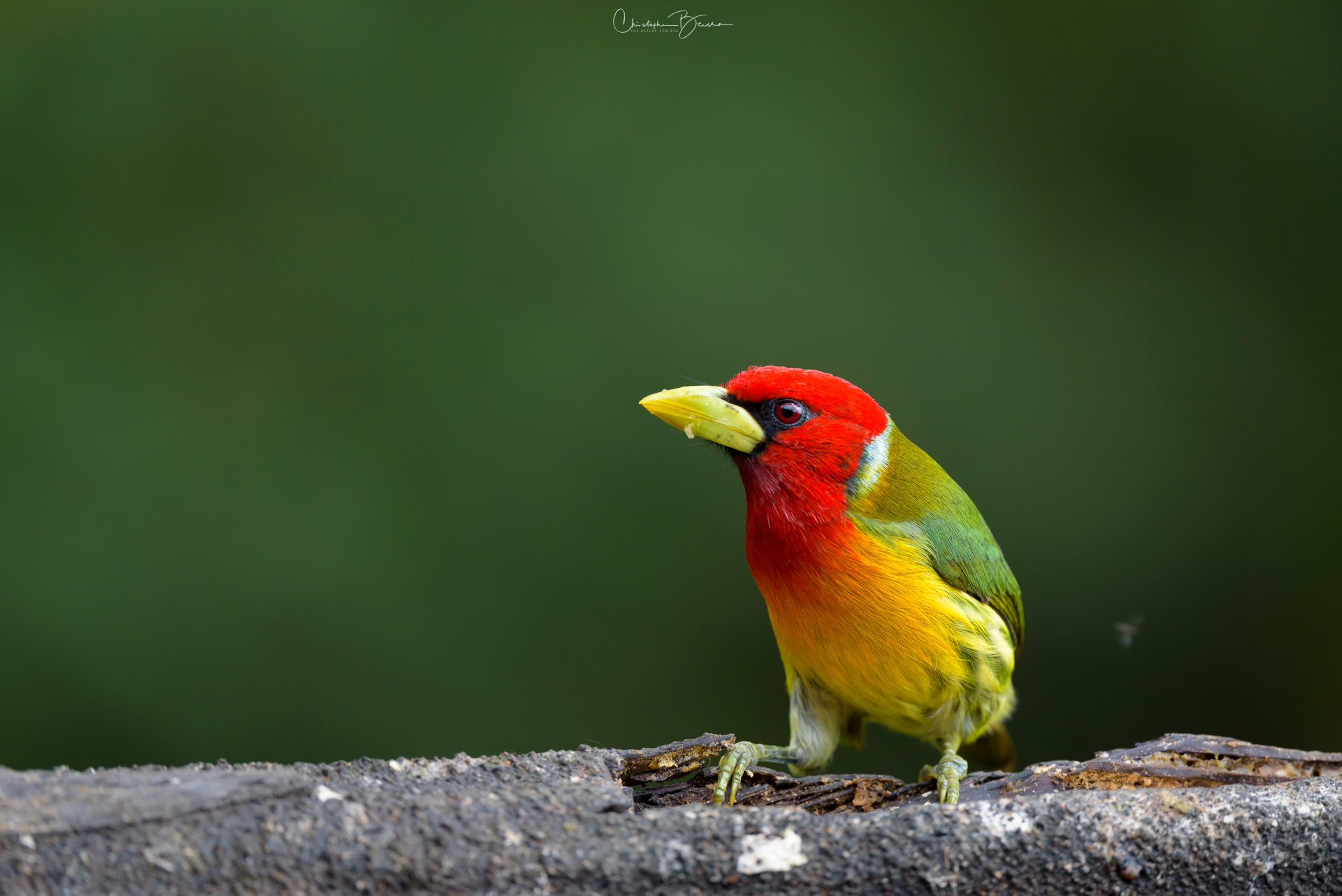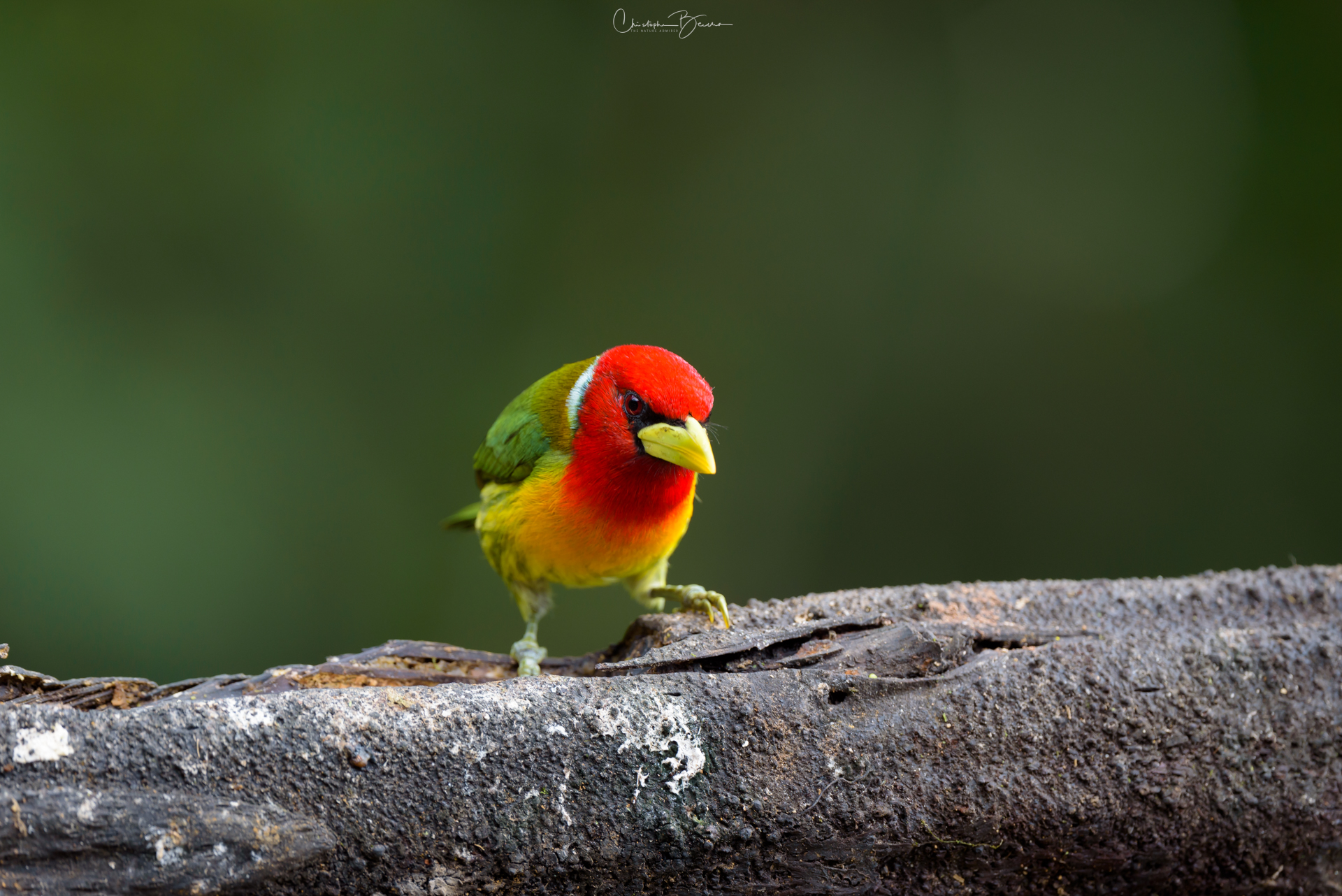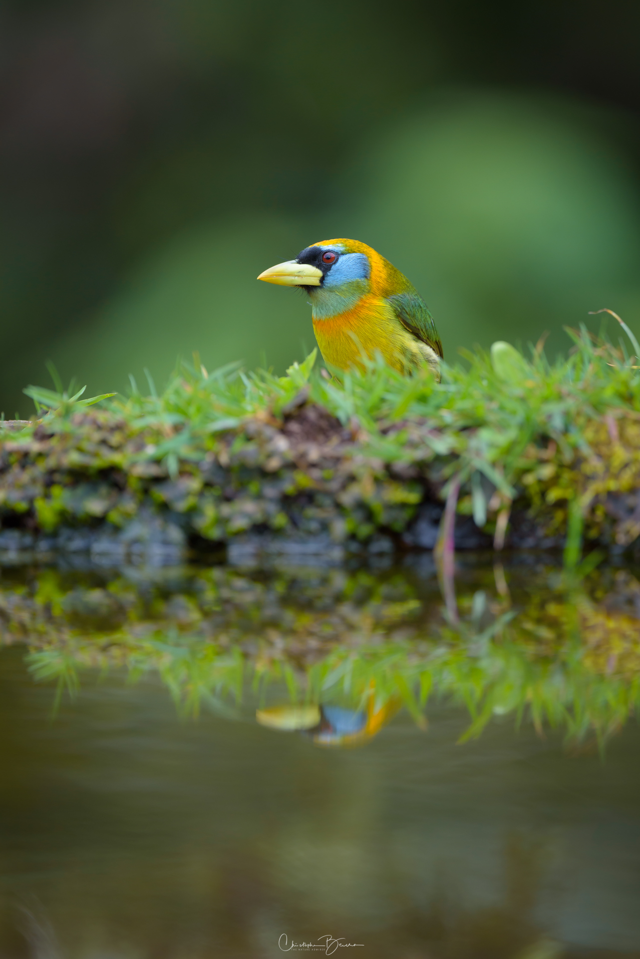 This bird is a beauty, one that we can find in some spots around Costa Rica like Cinchona and Braulio Carrillo. I first met it during this trip to Colombia in Finca Alejandría, where a pair of this species would come and go from the feeders frequently. It is bigger than most tanagers, however it is rather small when compared with how I imagined it. It is the sole species of the Eubucco genus that is found in Costa Rica, with Colombia also hosting the Lemon-throated Barbet. They are related to the toucans, and as such they eat a lot of fruit, however they do not share the Toucan’s behavior of raiding other birds’ nests for eggs and hatchlings. The male and female only share the green body and yellowish beak, with the male having a red face with a white ring separating it from the back, a belly that transitions from deep orange to yellow as it goes down, and flanks that are streaked green and light yellow. On the other hand, the female features a black face with light blue cheeks, orange half hood and patch on the chest, light yellow belly and again streaked flanks in green and light yellow.