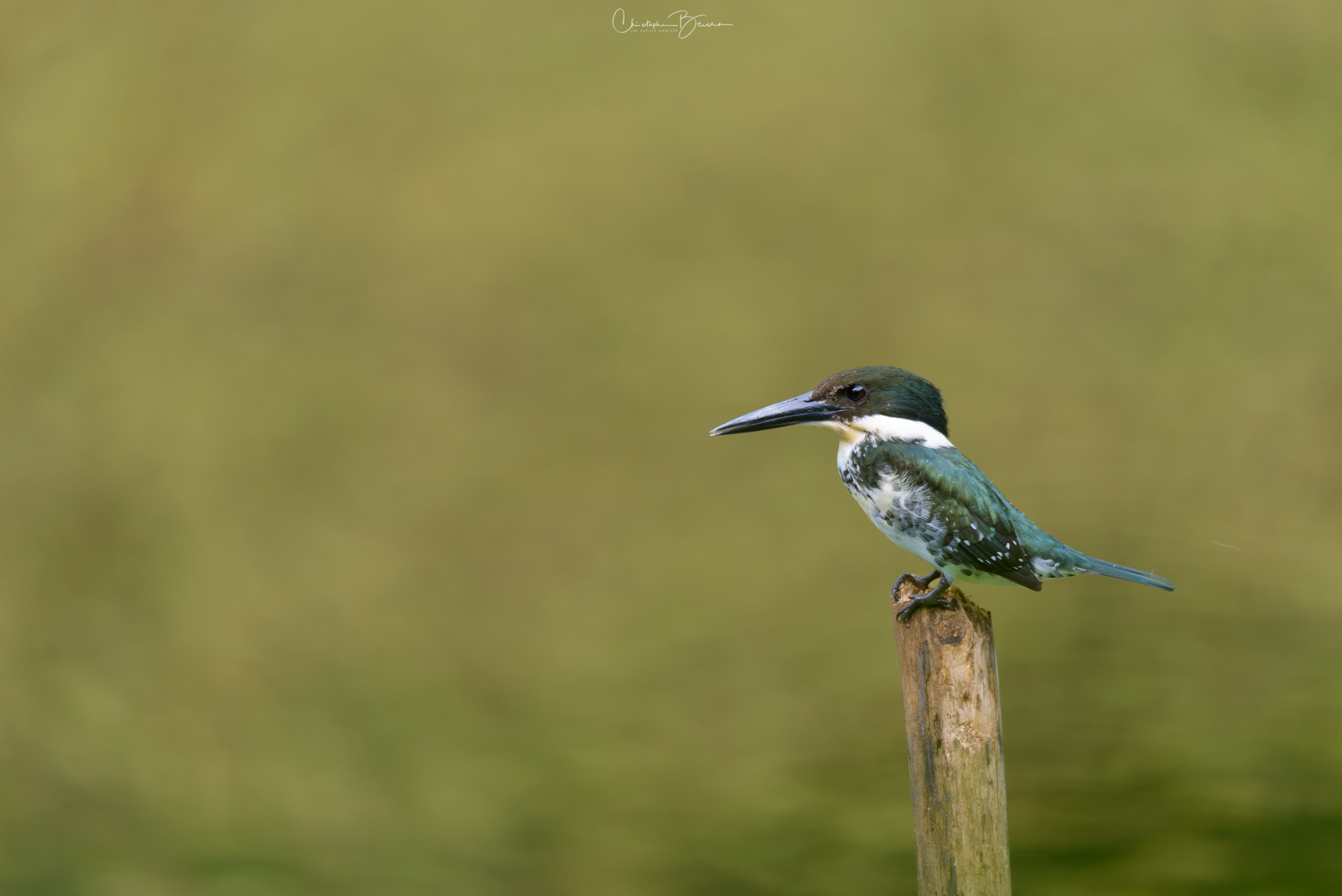 The Amazon Kingfisher is a mid-sized kingfisher, larger than the other green kingfisher species, but smaller than the Ringed and Belted Kingfishers, which are overall blue in color, the smaller to inhabit Costa Rica. It is very similar to the Green Kingfisher, however the Green is larger and lacks both the white spotting on the wings and the white outer feathers of the tail. Like most species of Kingfishers, it is found close to any wetland habitats, where they can catch small fish and crustaceans. The male featured in the pictures below frequented a small stream of water, which had risen due to recent heavy rains, about 100 meters from my parent’s home. It would perch on the fence wire and stay motionless for minutes at a time, only balancing as the wire would start to move upon landing on it.