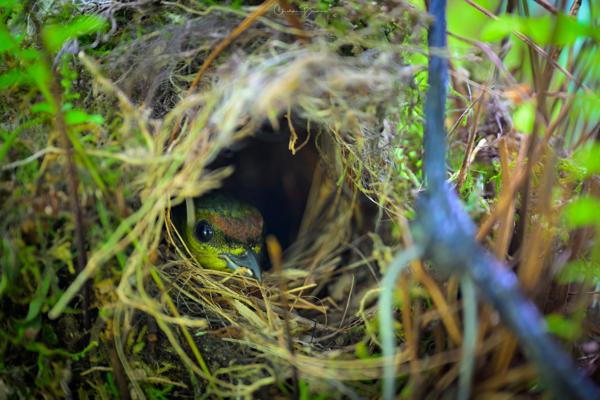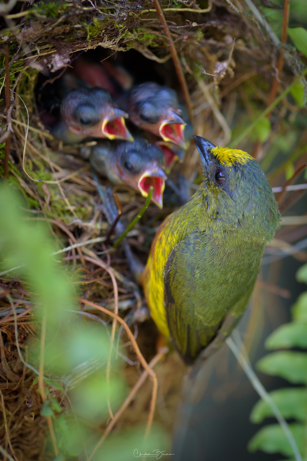 The Olive-backed Euphonia is very peculiar among the family of euphonias. Most euphonias are blue and yellow, but the Olive-backed has green and brown tones in the underparts, with olive in the back and a small yellow patch on the nape. In a lucky sight, I witnessed a parent feeding small pieces of banana to a juvenile, which agitates the wings very fast to get some food. Interestingly, the juvenile was near banana in the feeders, but instead of grabbing their own pieces, it preferred the pieces that the parent was giving him / her.
