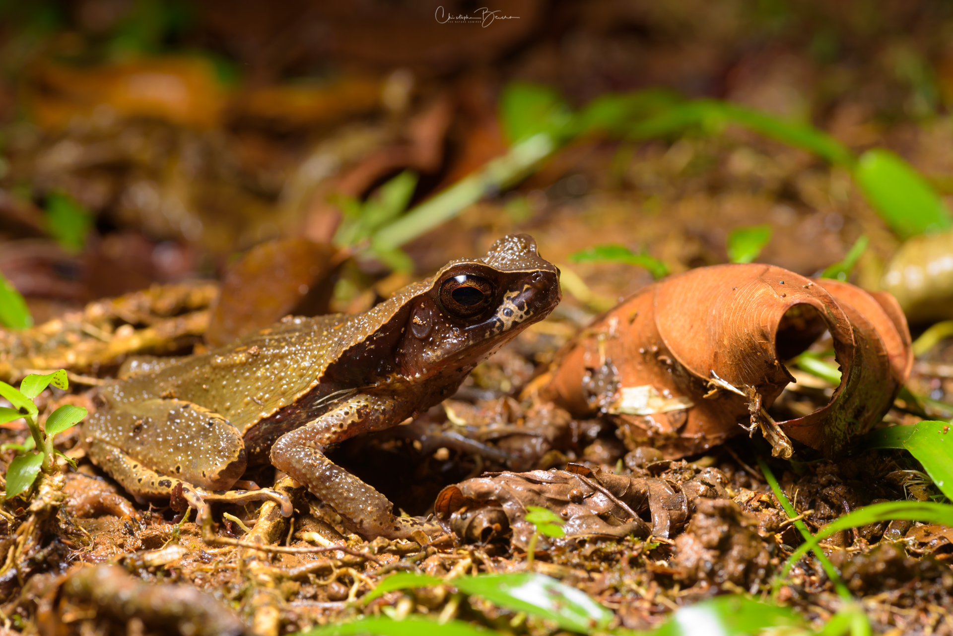 The Smooth-skinned Toad (or Leaf-Litter Toad as it is called sometimes) is a species of true toad that bears a dead-leaf pattern on its skin, concealing it from most predators when they lie motionless on tree bark or on the ground. Furthermore, their lifestyle is nocturnal, so during the day they don’t move much, unless spooked. They rely on camouflage to be safe, even around streams, where their dull colors can match the colors of the rocks. They are small, close to the size of a female Green and Black Poison Dart Frog, but their overall coloration is a dull brown with orange and dark blue patches, making them inconspicuous against the brown layer of leaf litter where they are usually found.