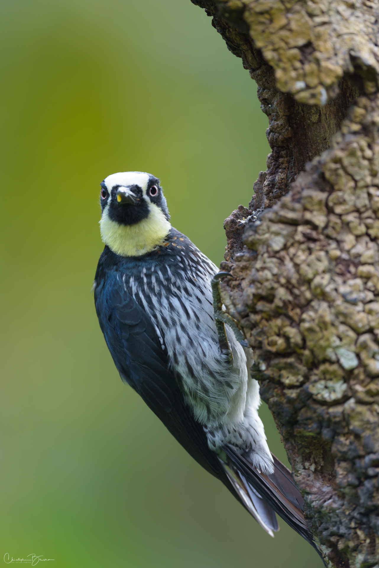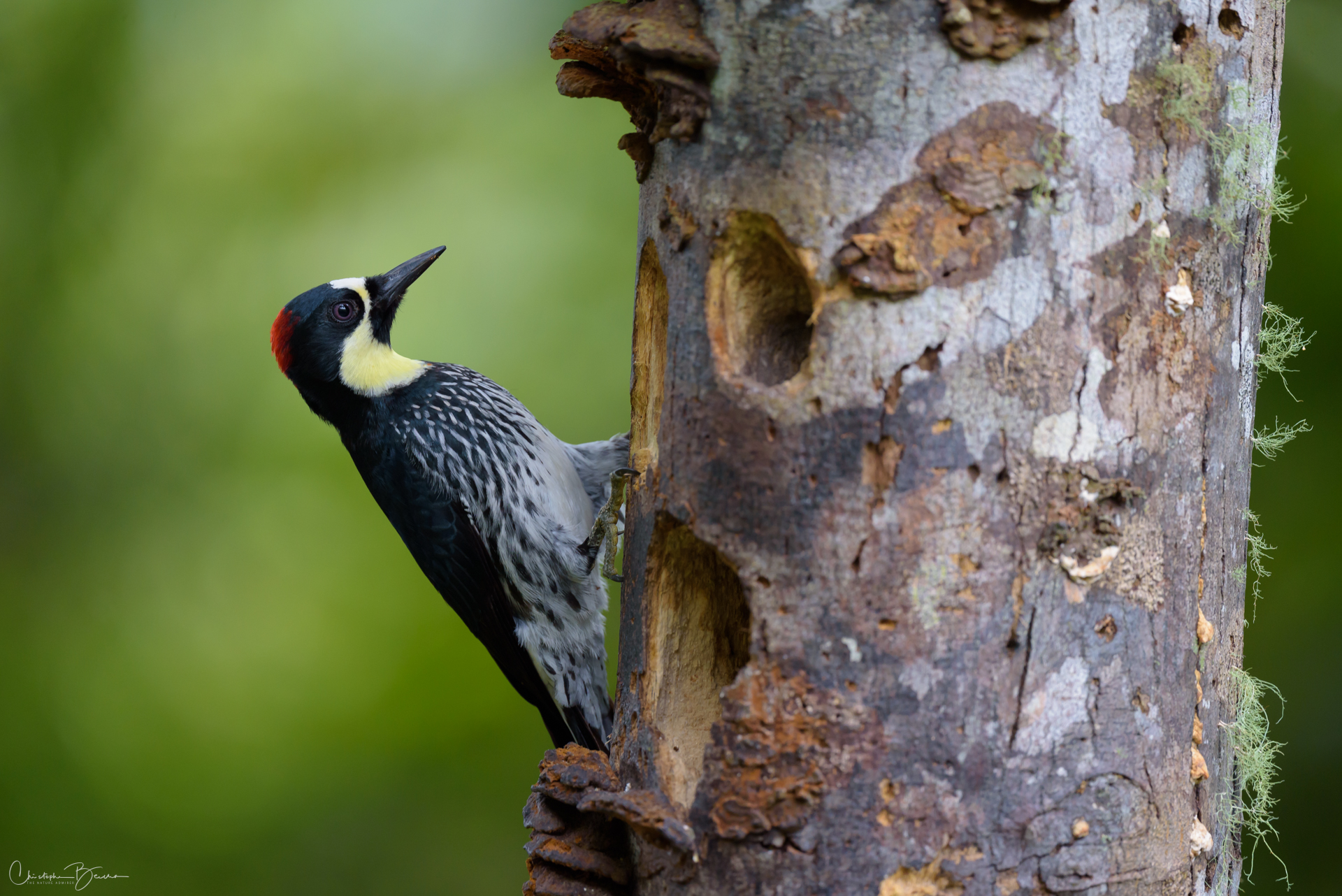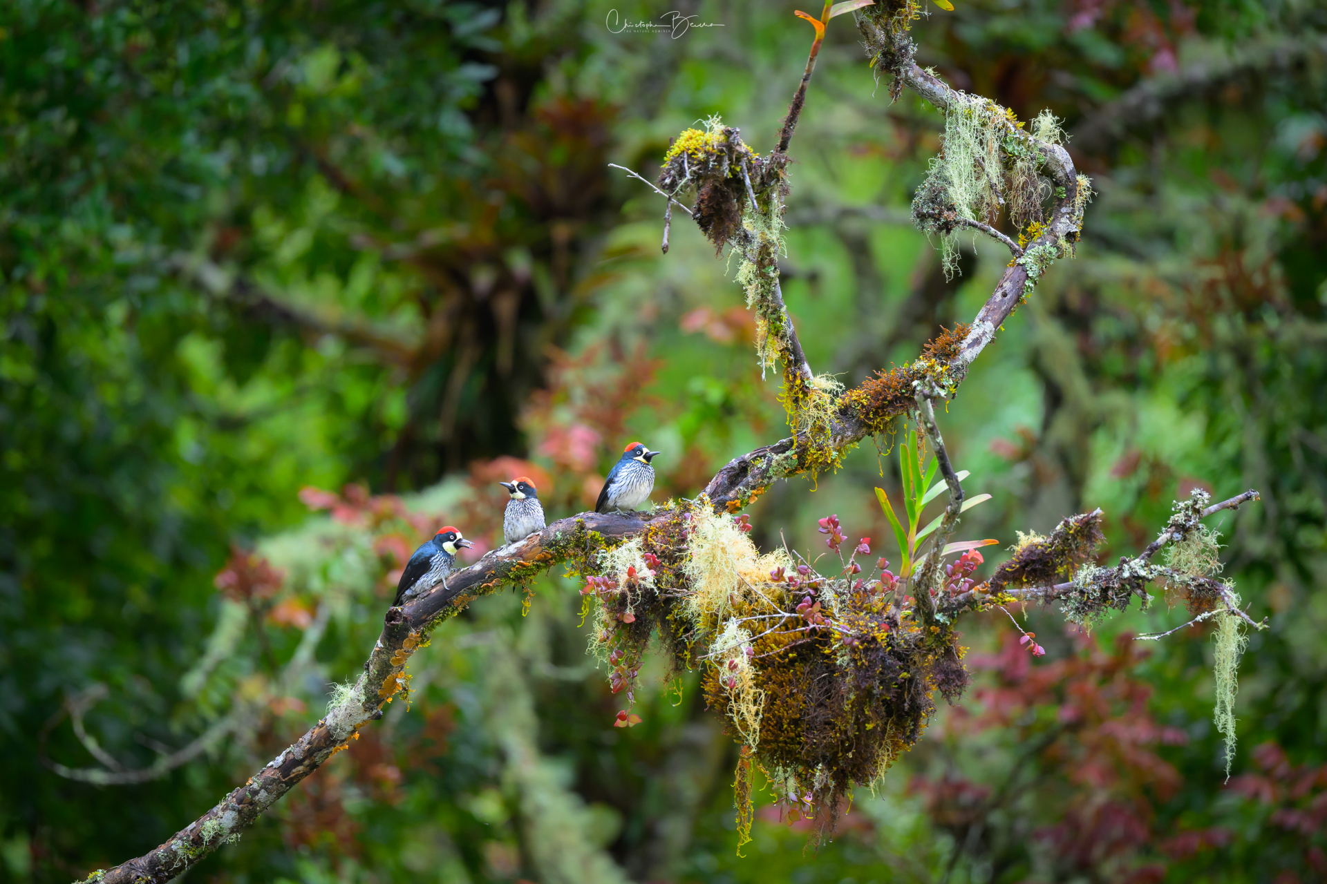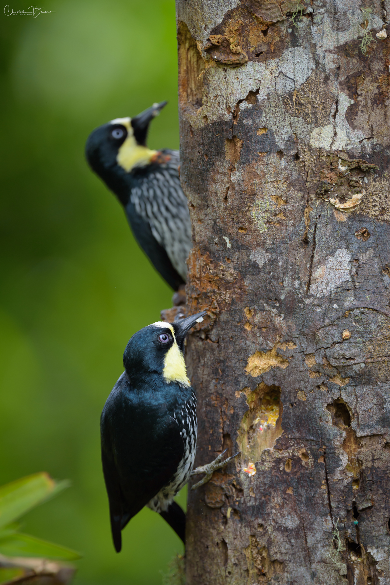The Acorn Woodpecker is one of Costa Rica’s largest species, only topped in length by the Lineated and Pale-billed Woodpeckers. The funny-looking pattern on its face earns it the local name “little clown”, with a conspicuous red crown, and a black and yellowish-white mask that cover the face and throat. The iris is almost white, and the bill is black. While the back and wings are entirely black, the chest has black and white streaking, and the belly is white. The female can be identified by a small black patch on the front of the crown, whereas the male’s crown is entirely red. Their inhabit the highlands, particularly Cerro de la Muerte (Buenavista) and Cordillera de Talamanca, where they are very common. Their call display is also very showy when compared with other Costa Rica woodpeckers, swinging their body from one side to the other while giving their calls away.