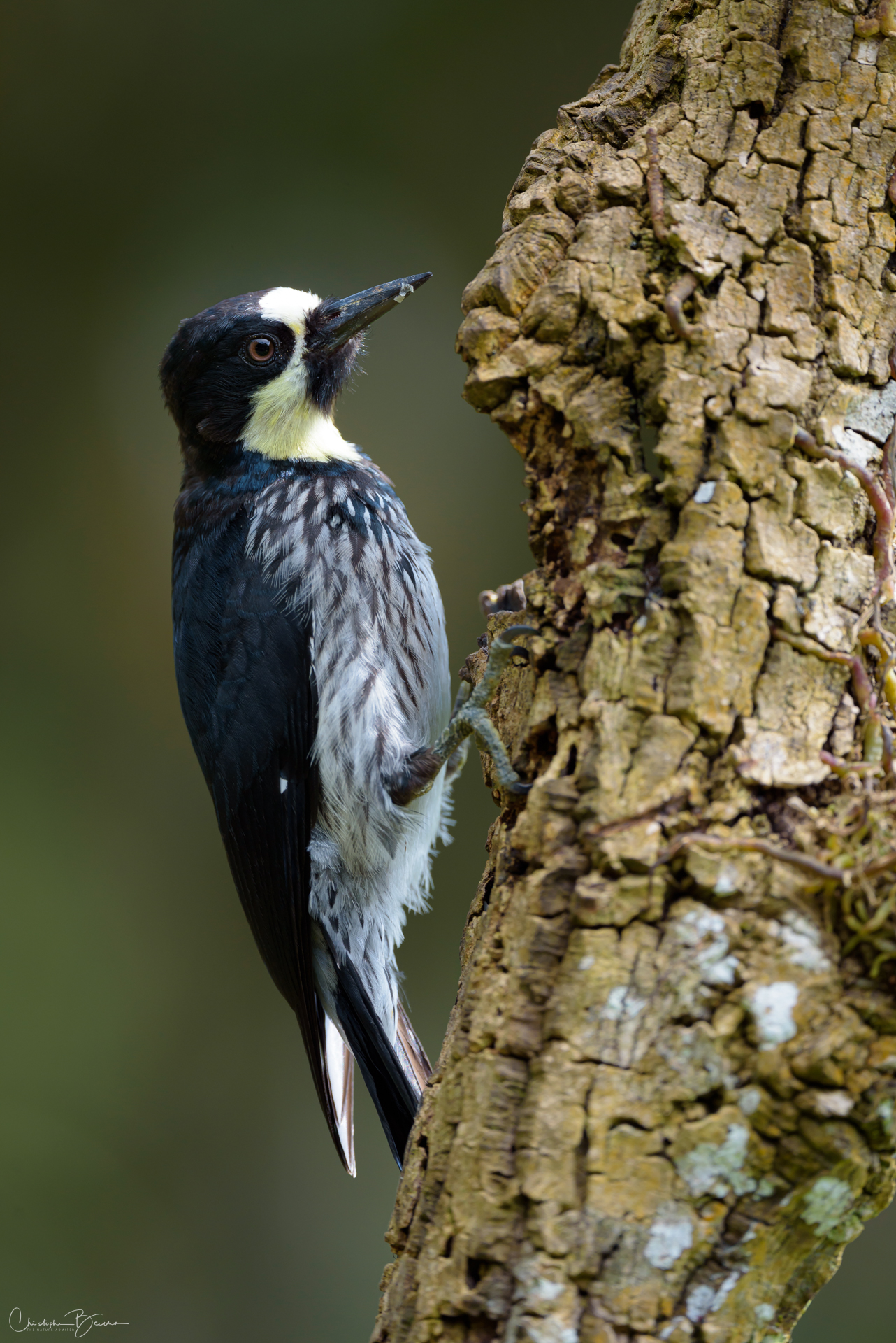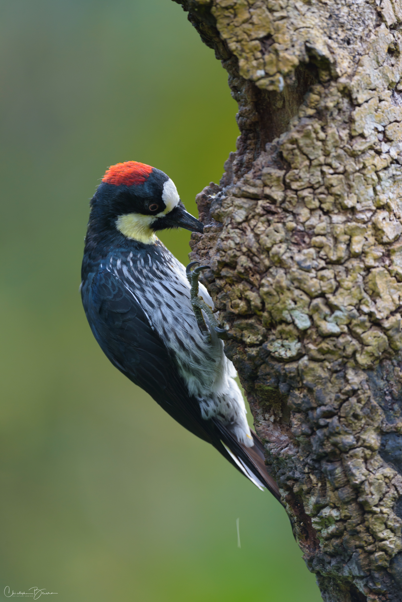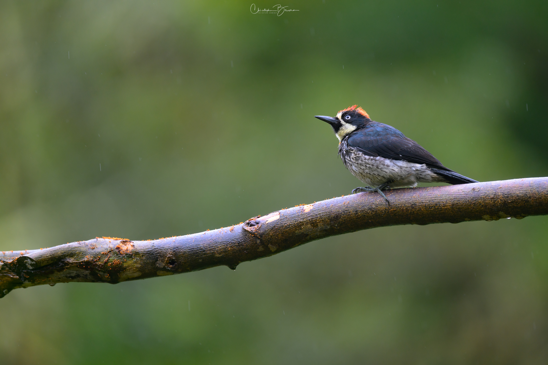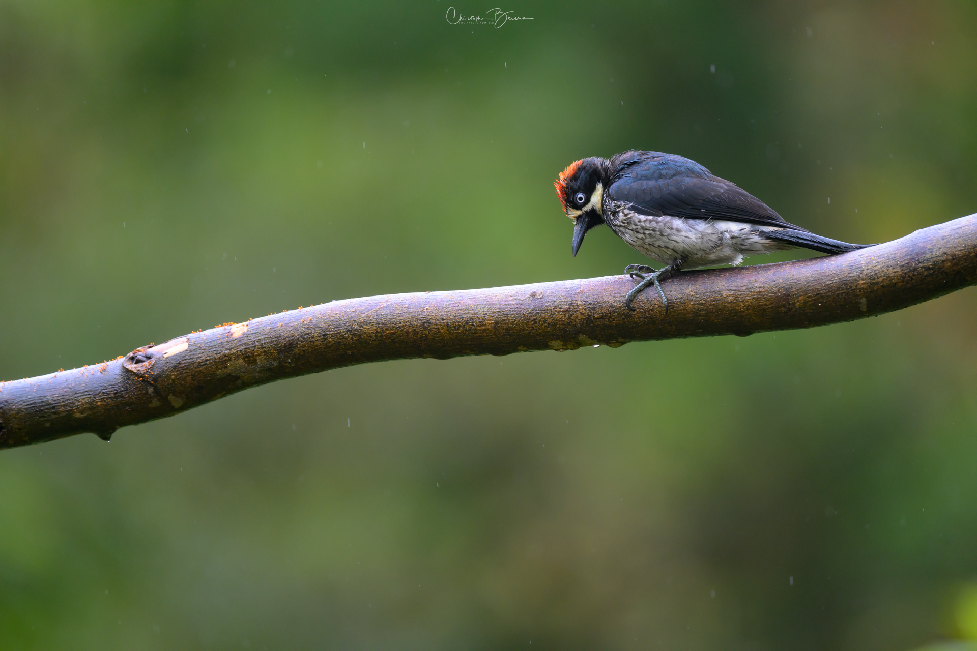 The Acorn Woodpecker is one of Costa Rica’s largest species, only topped in length by the Lineated and Pale-billed Woodpeckers. The funny-looking pattern on its face earns it the local name “little clown”, with a conspicuous red crown, and a black and yellowish-white mask that cover the face and throat. The iris is almost white, and the bill is black. While the back and wings are entirely black, the chest has black and white streaking, and the belly is white. The female can be identified by a small black patch on the front of the crown, whereas the male’s crown is entirely red. Their inhabit the highlands, particularly Cerro de la Muerte (Buenavista) and Cordillera de Talamanca, where they are very common. Their call display is also very showy when compared with other Costa Rica woodpeckers, swinging their body from one side to the other while giving their calls away.