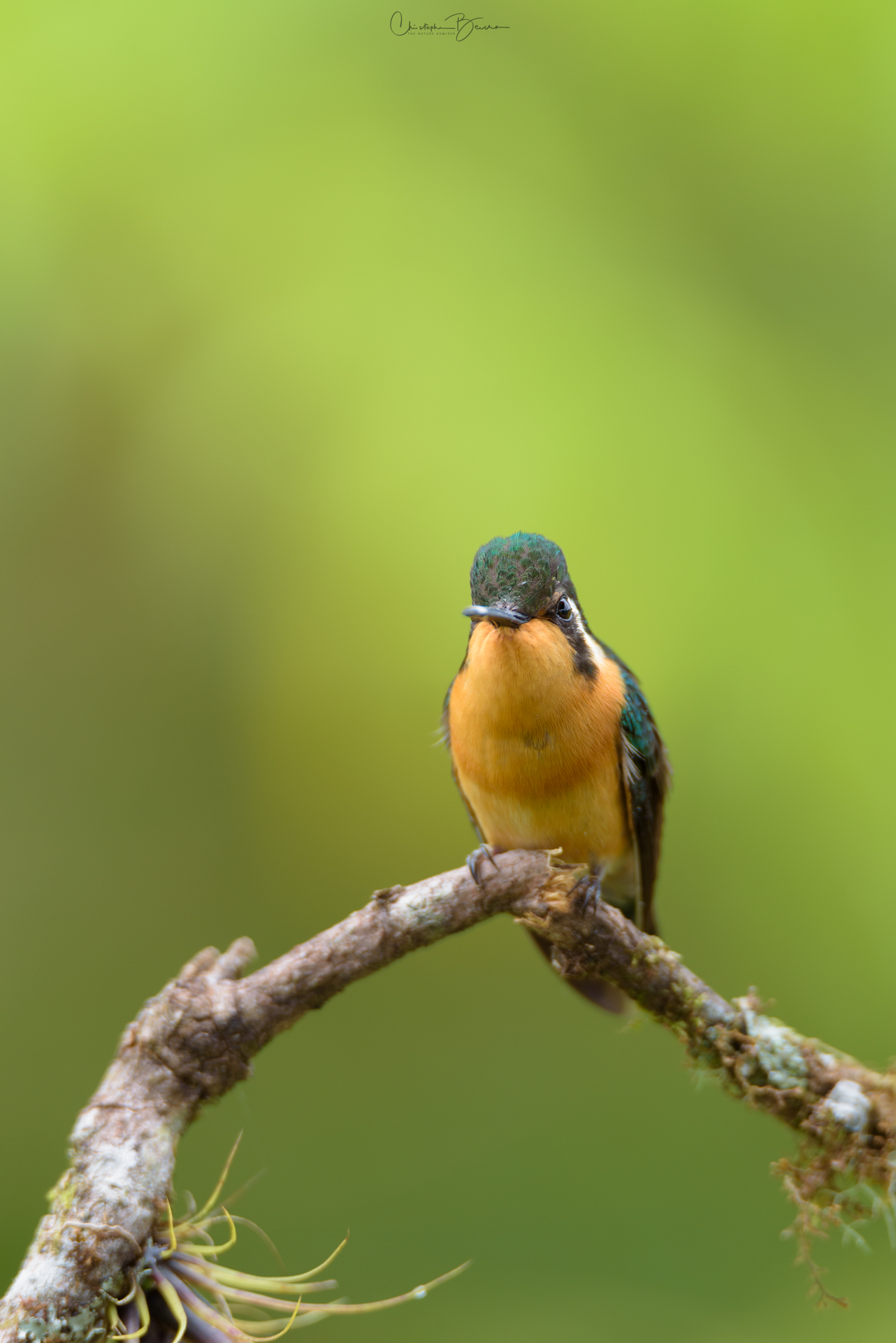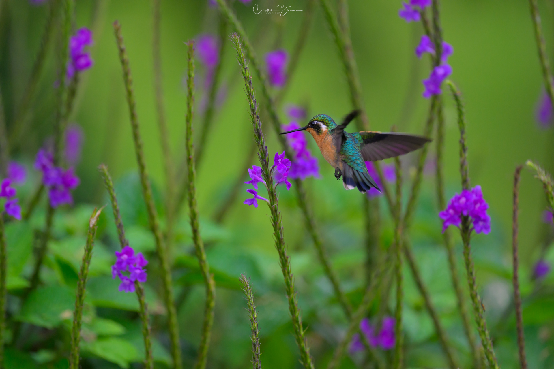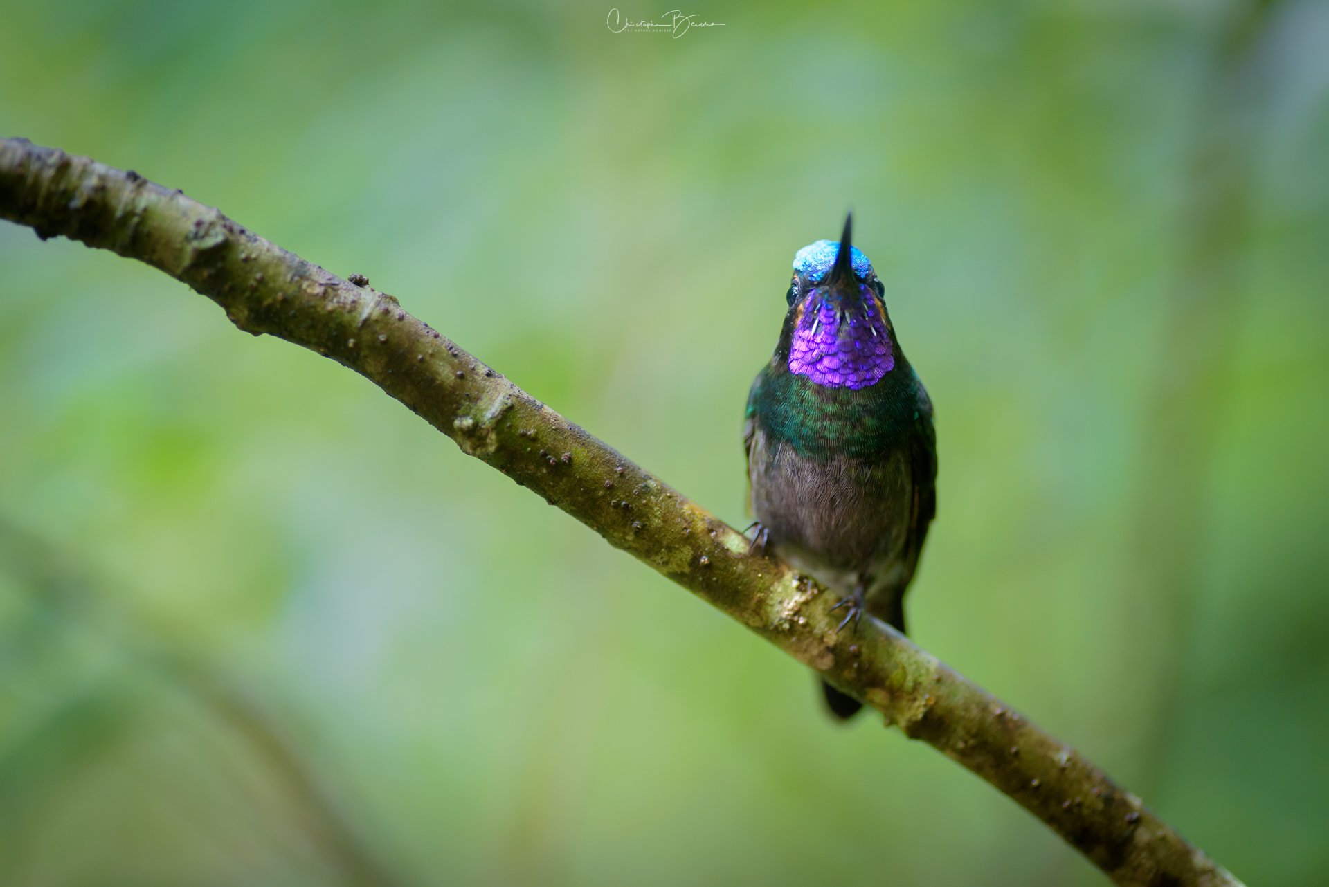 The Purple-throated Mountain-gem is a striking hummingbird, where the male has a brilliant, iridescent throat the turns purple. The crown also changes color, from dark purple to metallic blue, all due to the angle of light that is hitting it. The upperparts are mainly green, although the belly is gray and the chest has a broad metallic green band as well. The female is similar but has a cinnamon belly, chest and throat, which does make it look very contrasty and eye catching. Both sexes have a white postocular line that reaches down and back almost to the neck. They are mostly seen in mid elevation cloud forests. The iridescence in hummingbird means that there is something different about each picture, even of the same individual.