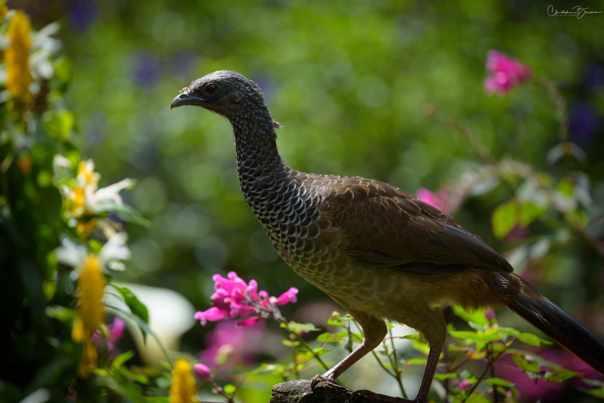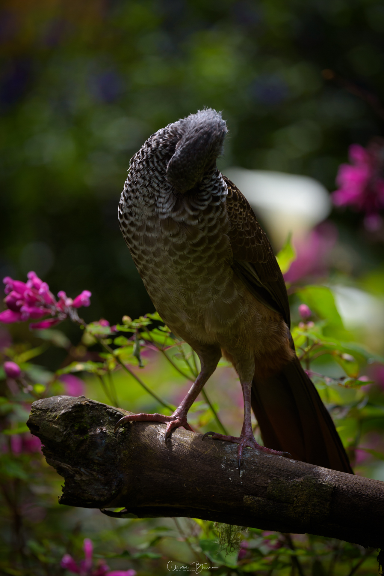 Most Guans and Chachalacas are big arboreal birds, and can show great agility when jumping from branch to branch on the top of the canopy some 20 or 30 meters above the ground. They perch to eat fruits and also to roost in the night. Most species avoid the ground but come down sometimes in search of fruits and seeds. The Colombian Chahcalaca is found in the Andes Region, having brown coloration but with an scaled look thanks to gray tips of the feathers’ barbs. Their head and beak is gray, and it has a bright red dewlap that is folded and inconspicuous, although it can hang freely and thus be seen clearly when the bird is high in the trees. The legs are also red. While shy of people, this species will come to fruit feeders and stay there undisturbed unless you get too close.