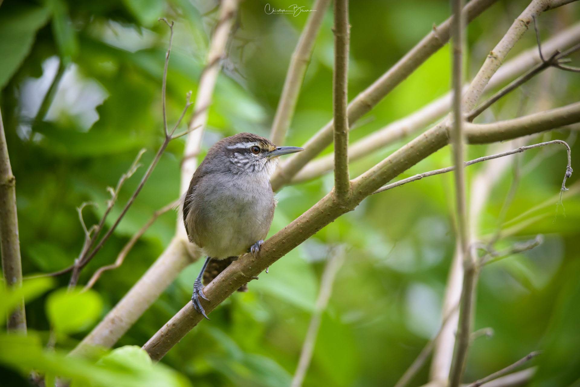 A recent split from the Plain Wren, all three species held this name because of the lack of most field marks when compared with most other wrens. Along the Cabanis’s which can be found in the northwest region of Costa Rica, the Canebrake Wren occupies the Eastern portion (Caribbean), and the Isthmian Wren is found in southern region of the country. These small birds have a brown eye with white supercilliary, brown upperparts with the tail showing black stripes. The underparts are grayish to white. Like most wrens, the Cabanis’s is an avid songbird. Its song is complex, consisting of a variety of high notes and chirps that give away their presence. Even so, they are difficult to locate as their main habitat is dense forest edges, where they jump from branch to branch, camouflaged by the leafs and branches of bushes and trees.