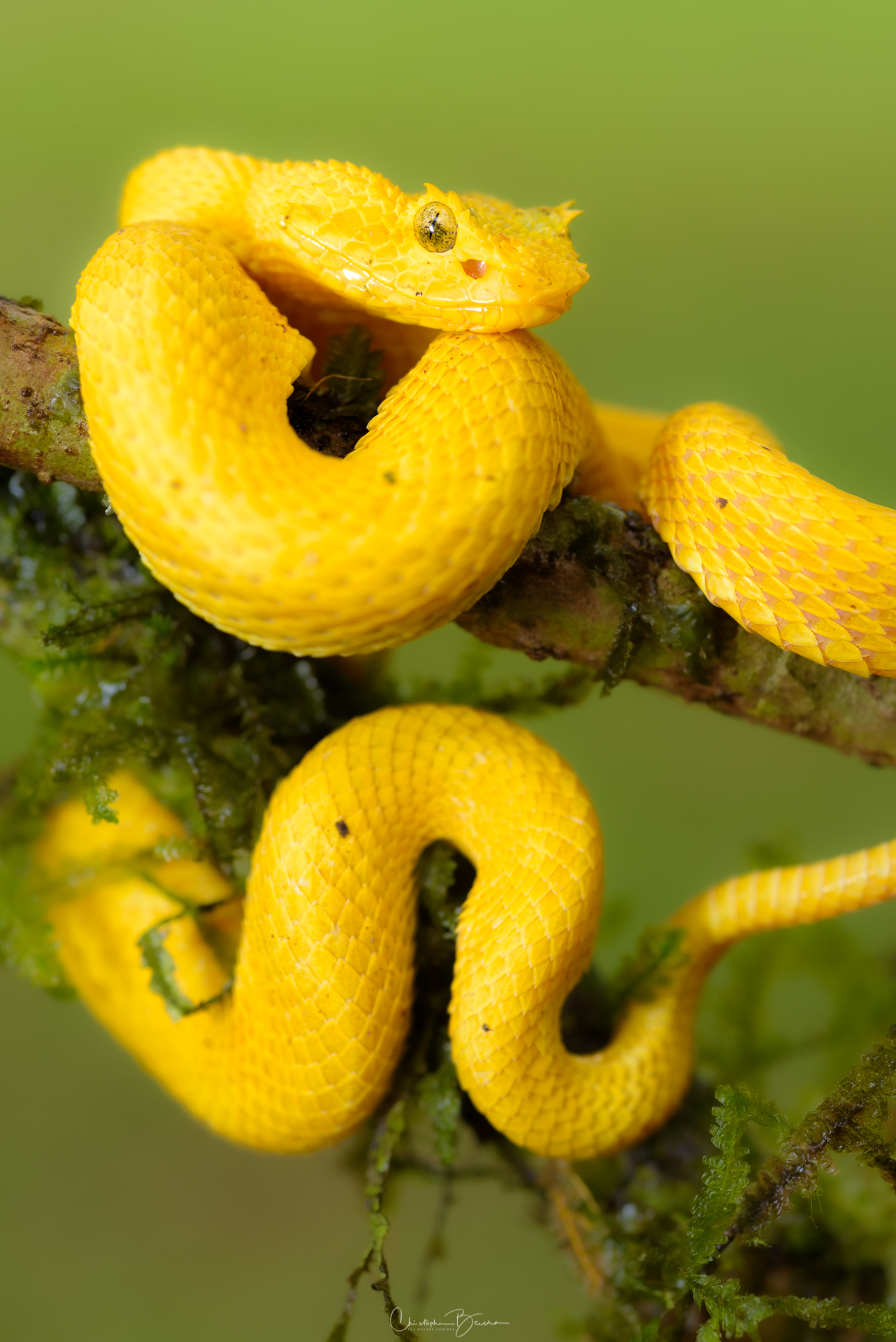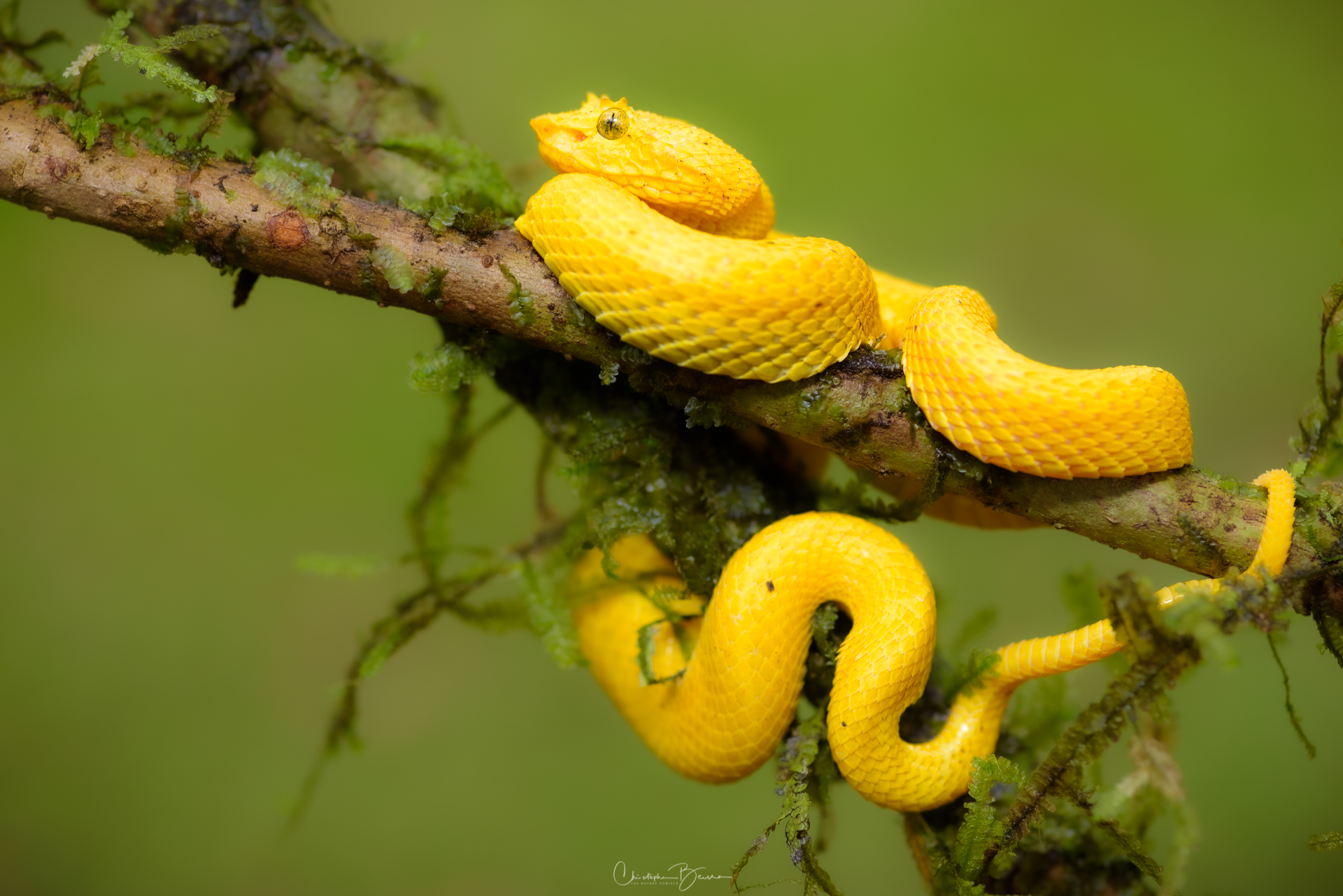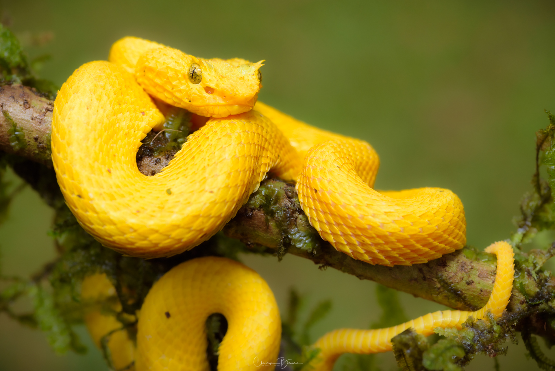 The Eyelash Palm-Pitviper is an arboreal venomous snake, found in Central and South America, with a diverse array of skin colors, the yellow color potentially being the most impressive and rendering them unmistakable, which gives them one of its most recognizable nicknames: “Oropel”, whose root is “oro” that means gold. It shares its genus with the Side-striped Palm-Pitviper. It is called Eyelash due to the scales right on top of the eyes. They grow up to 82 centimeters in length, which is not very long between viper species. Its head is triangular in shape and its tail is prehensile, helping it grab branches to maintain its balance. They hunt by ambush, waiting in a spot for prey, particularly birds during the annual migration.