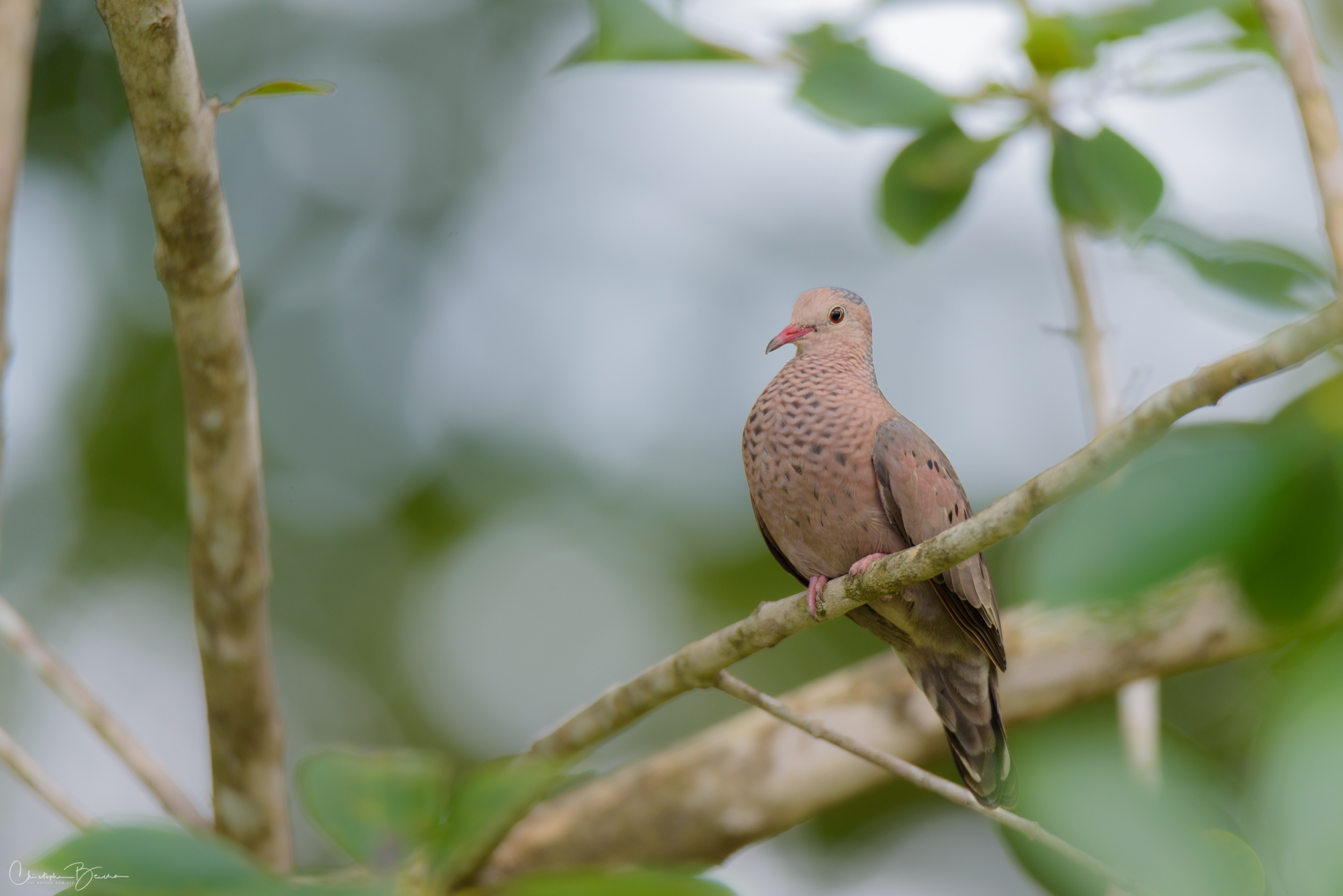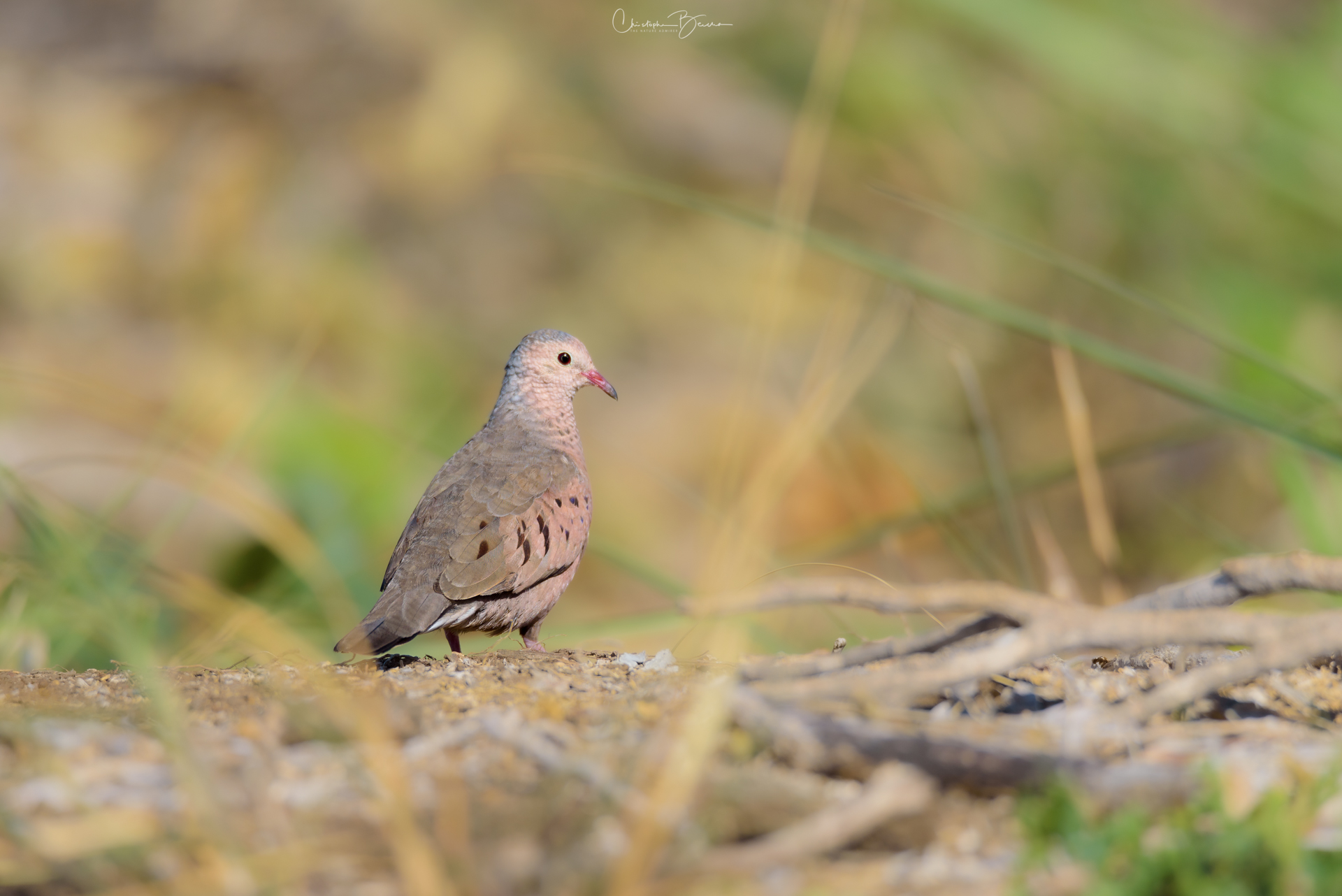 The Common Ground-Dove is very similar to related species Ruddy and Plain-breasted Ground-Doves, however the Common is lighter in coloration, with a pink bill that is diagnostic; it also shows a scaled pattern in the throat and neck, which is missing from the other ground doves. Also similar to these species is the Inca Dove, which even behaves similarly as it forages most of the time on the ground, however the scaled appearance in the whole body should preclude any confusion. The male is ligher than the female, which looks grayish. All ground doves feature dark spots in the tips of primaries and secondaries, which look like a curved line when the wings are closed, although the Common’s should area spots are more numerous and do not form a line.