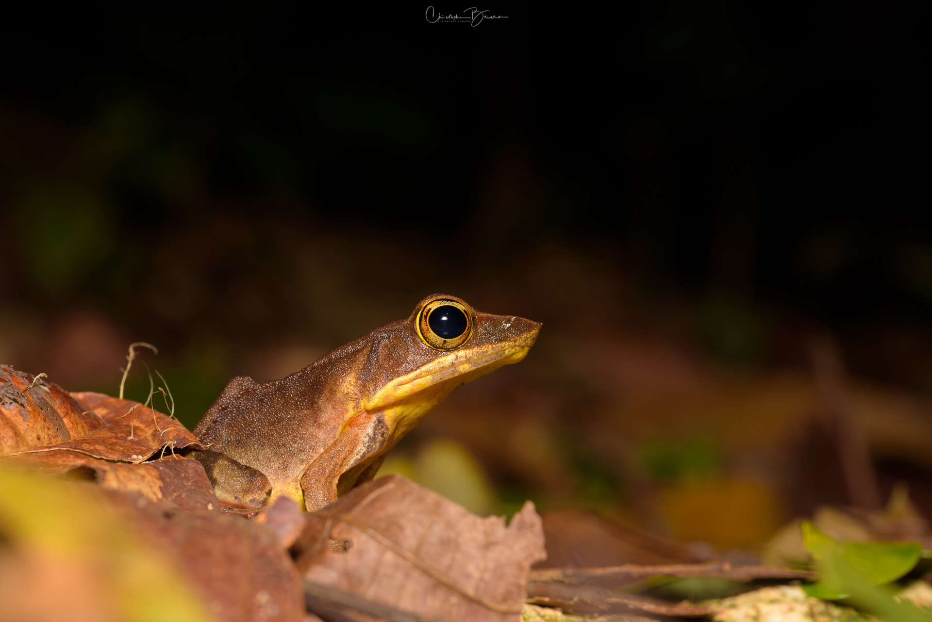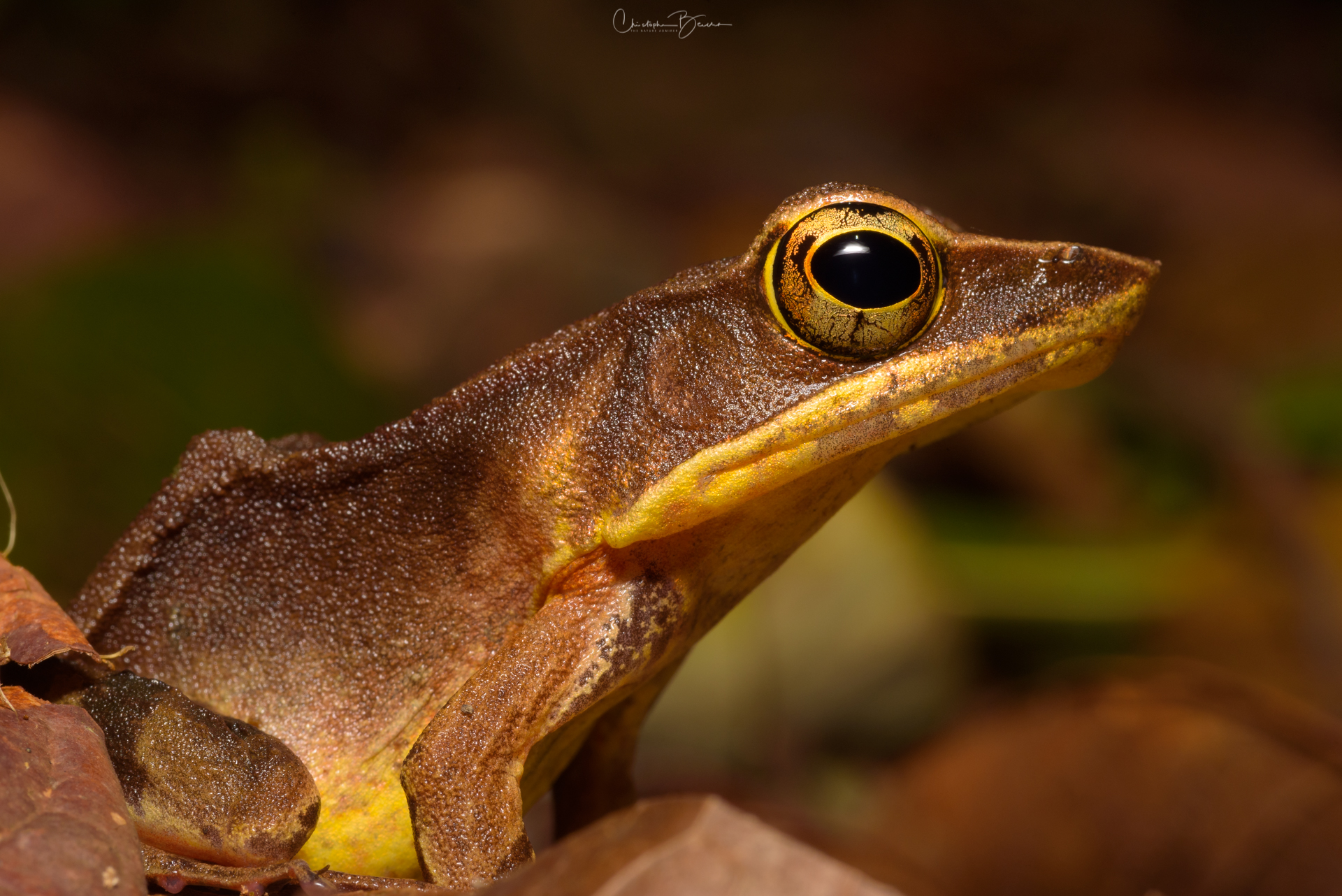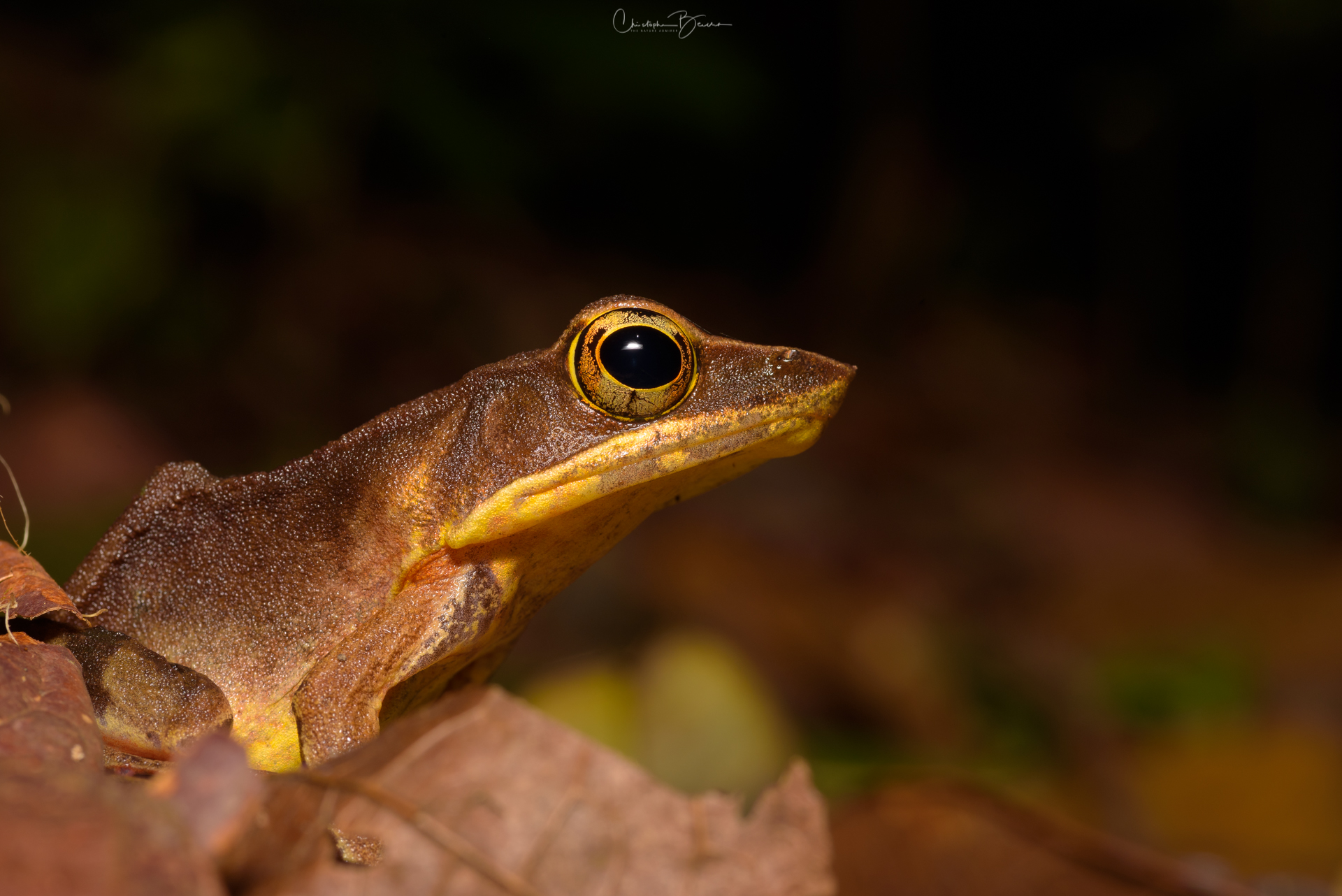 The Brilliant Forest Frog is a widespread frog of the True Frogs family, however they are most frequently found on the leaf litter in the dense forest, unlike most other members of the family which inhabit ponds and other bodies of water. We found the individual below as we hiked through one of the trails at Yatama Ecolodge. Surprisingly, it stayed put in the same place for about 20 minutes, not moving even once. I put the camera directly on the ground close to where it was, used pebbles and dead branches to balance it, removed dead leaves and twigs from the surroundings to clean up the background a little bit, and the frog did not even twitch. It probably felt very confident in its camouflaged appearance; as a matter of fact, we would have not spotted it, if it had not hopped once when the we approached it at the trail. Also in a different trip to Yatama, I found two individuals close to our cabin after returning from a short night walk, presumably a male and a female given the size difference, and I observed the exact same behavior.