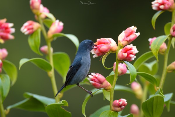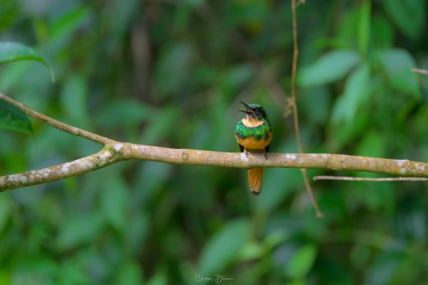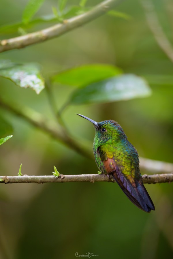 I am frequently asked if those smooth green backgrounds are some kind of photoshop trick (spoiler: They are not). Half of the trick is the equipment, which means having a lens with plenty of reach helps to produce smooth backgrounds. The other half is technique, or how to get close enough to animals without disturbing them in their natural setting, as the closer you get, the smoother the background. These techniques can also create light circles and blobs of color when there are light sources in the background, like in this Purple-throated Mountain-gem .