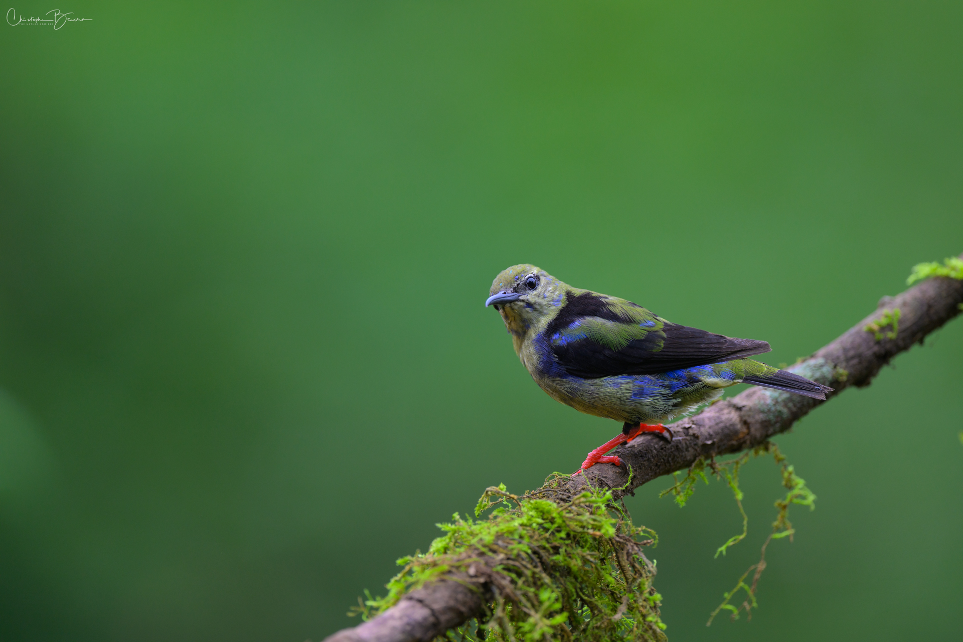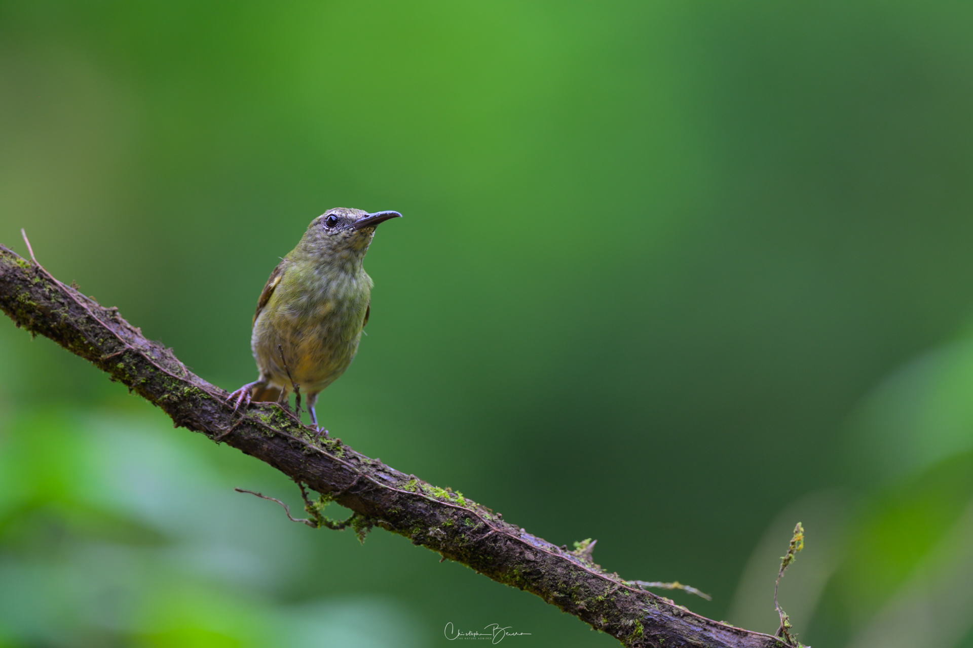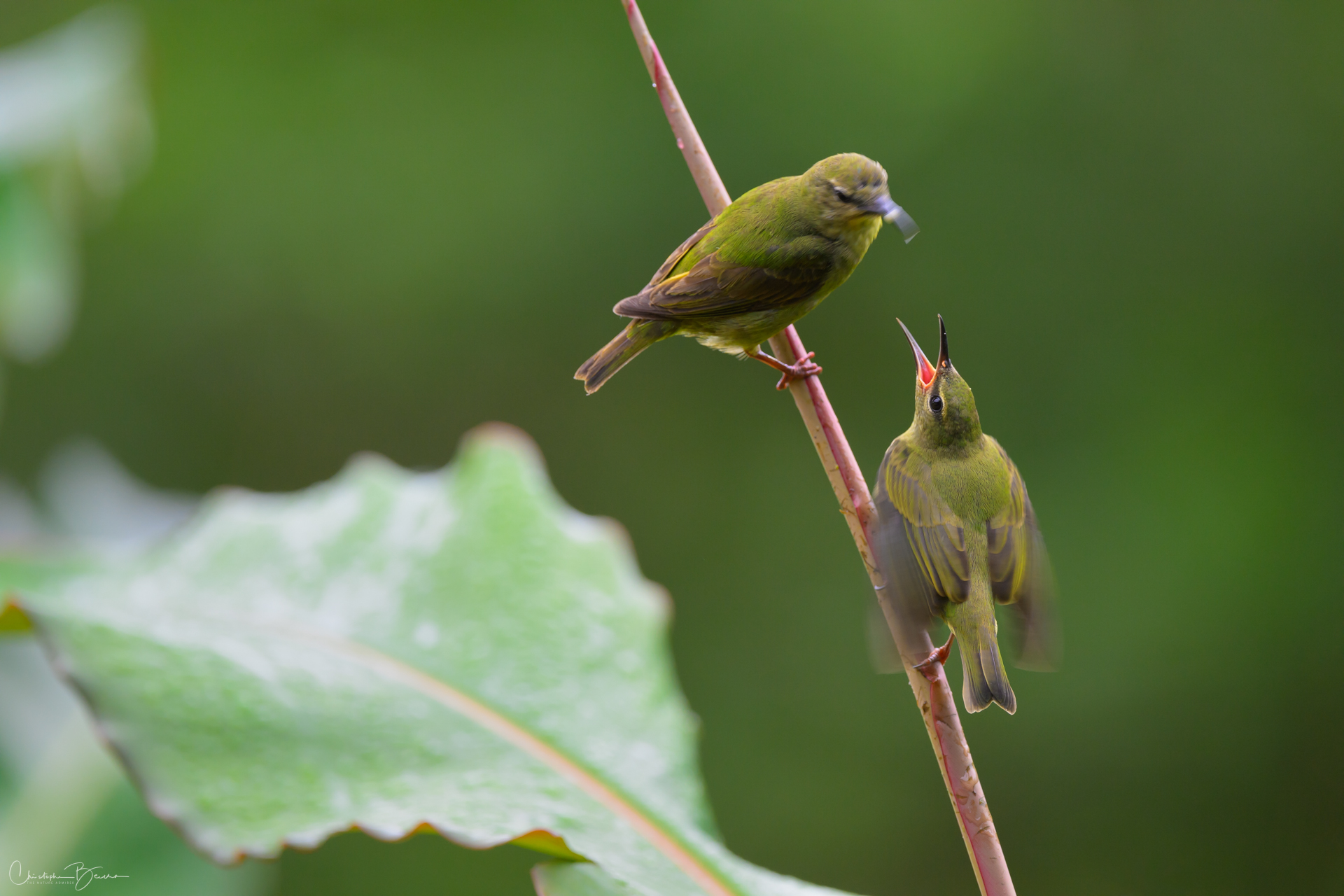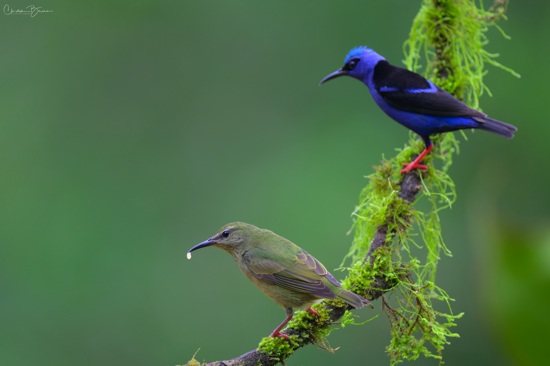 The Scarlet-rumped Tanager is known locally as “Sargento” (Seargent) and “Sangre de Toro” (Bull’s blood), among other names. Previously it was known as the Passerini´s Tanager, being virtually identical to the Cherries Tanager, but only inhabiting the Caribbean, whereas the Cherries was only found in the pacific. In sunlight, the red rump of the male glows strongly, contrasting with the deep black in the eyes and the rest of the body. The female is brownish in coloration, and differs from the Cherries by not having the orange throat. The Juvenile male has the same coloration as the female, however as it morphs into adult plumage, patches of black start to show in the body, giving it kind of a Calico look.